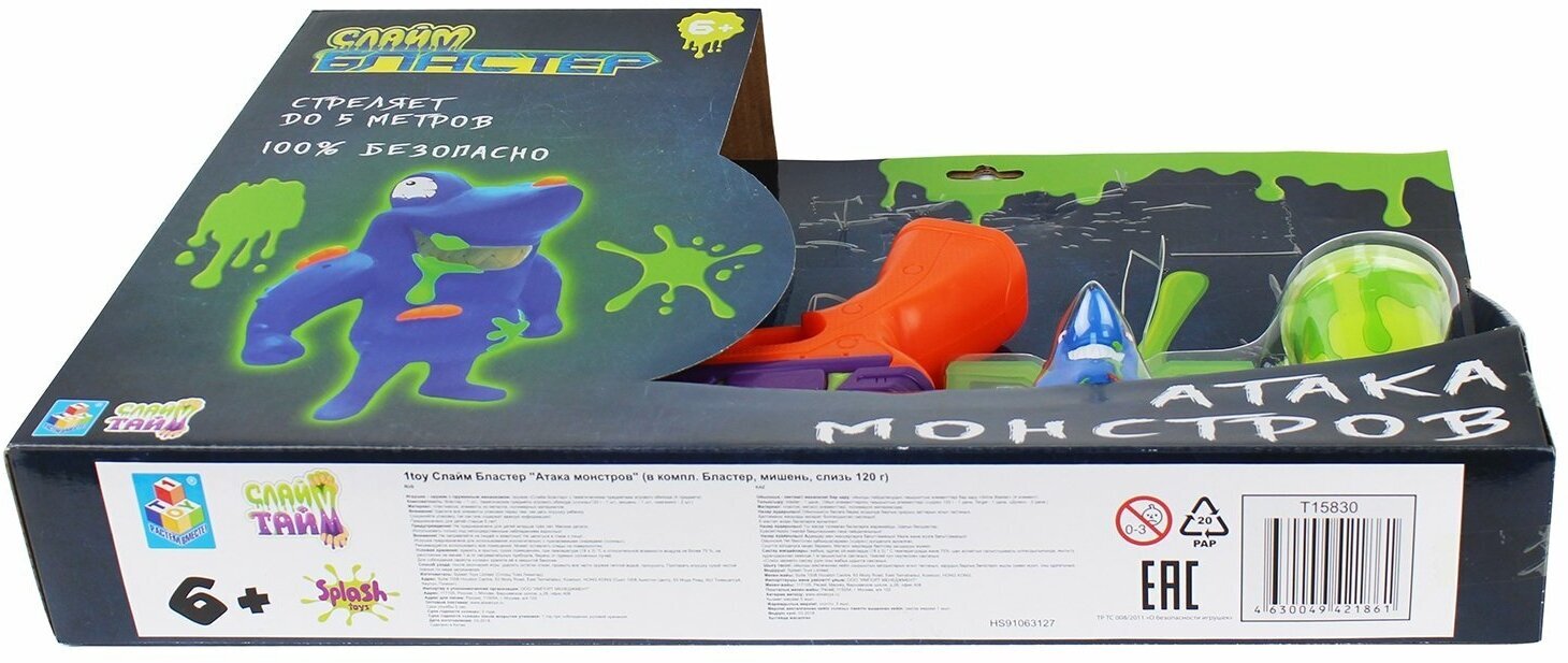 бластер стреляет слаймом, в комплекте упаковка слайма 120 г (до 500 выстрелов); рекомендуемый возраст от 6 лет; размер упаковки 30x47x7 см, вес упаковки 800 г