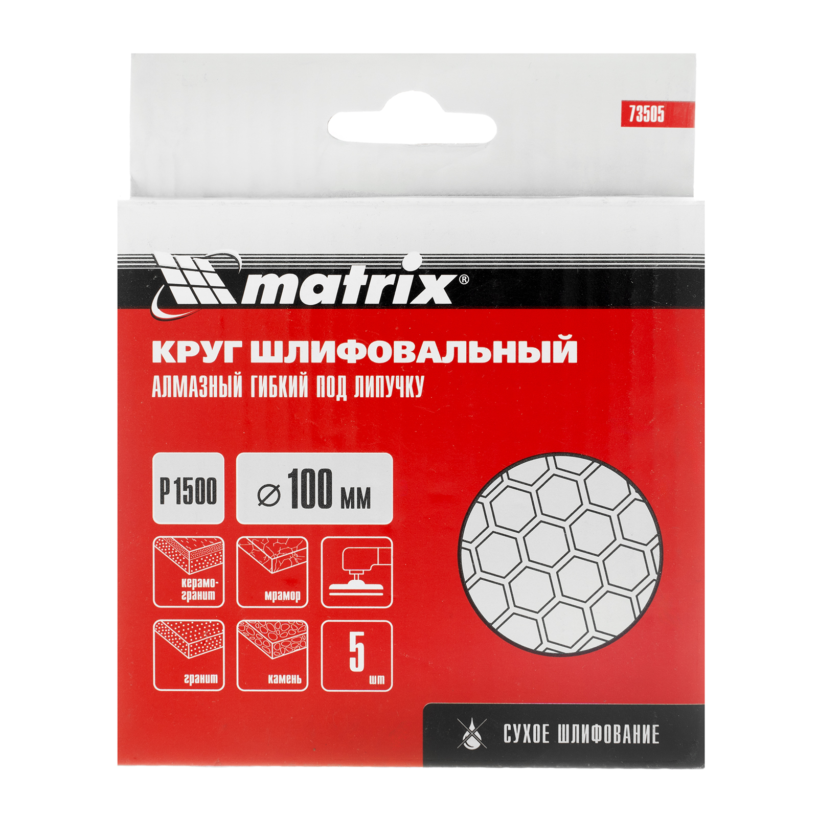 Алмазный гибкий шлифовальный круг Matrix 73505 диаметром 100 мм, с зернистостью P 1500, 5 шт. в упаковке, предназначен для сухого шлифования гранита, мрамора, природного и искусственного камня, керамогранита. Используется на поверхностях разного цвета, преимущественно белых. Абразив с зернистостью P 1500 применяется для финишного полирования поверхностей. Гибкий круг удобен для обработки предметов сложной формы. Оснастка используется на УШМ с установленной опорной тарелкой для АГШК.