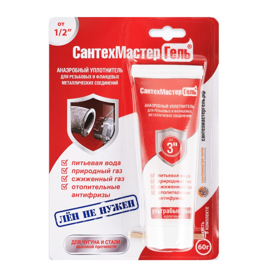 Предназначен для резьбовых соединений из черного металла. Этот анаэробный герметик отлично подходит для сверхпрочной фиксации и герметизации резьбы и фитингов в трубопроводах, собранных с использованием черных металлов. Используется для соединения труб диаметром от 1/2 дюймов. Герметизация с помощью этого геля-герметика настолько сильная, что при демонтаже соединение приходится подогревать. Состав рекомендуется использовать там, где необходим срочный запуск системы (общее время полимеризации геля не превышает 5 минут) при температуре окружающей среды от + 5 °C. Диапазон рабочих температур от -60 до +150°C.
