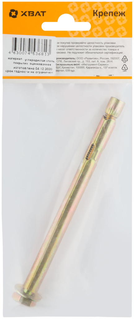 Втулка, болт и конус изготовлены из стали с электроцинкованным покрытием желтого цвета. Применяется для крепления различных тяжеловесных конструкций в полнотелых материалах (бетон, корпич, естественный камень).