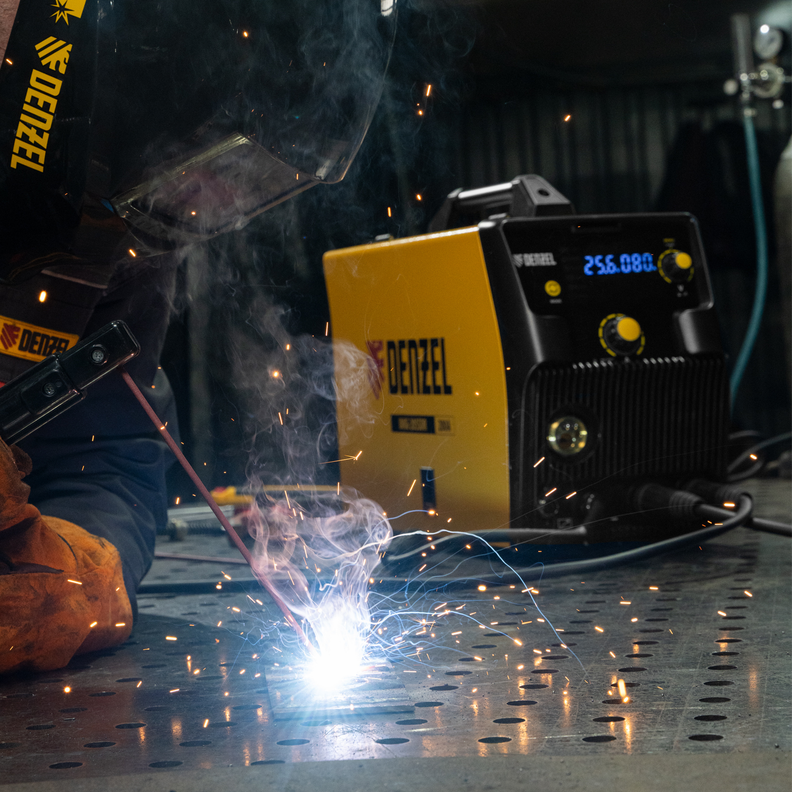 Инверторный аппарат полуавтоматической сварки Denzel IMIG-205SDR 94364 работает с максимальным сварочным током 200 A и совместим с катушками массой от 1 до 5 кг, продолжительность включения составляет 60%. Аппарат разработан с использованием передовой инверторной технологии IGBT, что обеспечивает стабильный сварочный ток на выходе и высокий КПД при низком энергопотреблении. Возможна работа при нестабильном напряжении в сети. Синергетическое управление упрощает подбор параметров сварки в зависимости от конкретной задачи: аппарат предлагает оптимальные значения напряжения, скорости подачи проволоки и т.д.