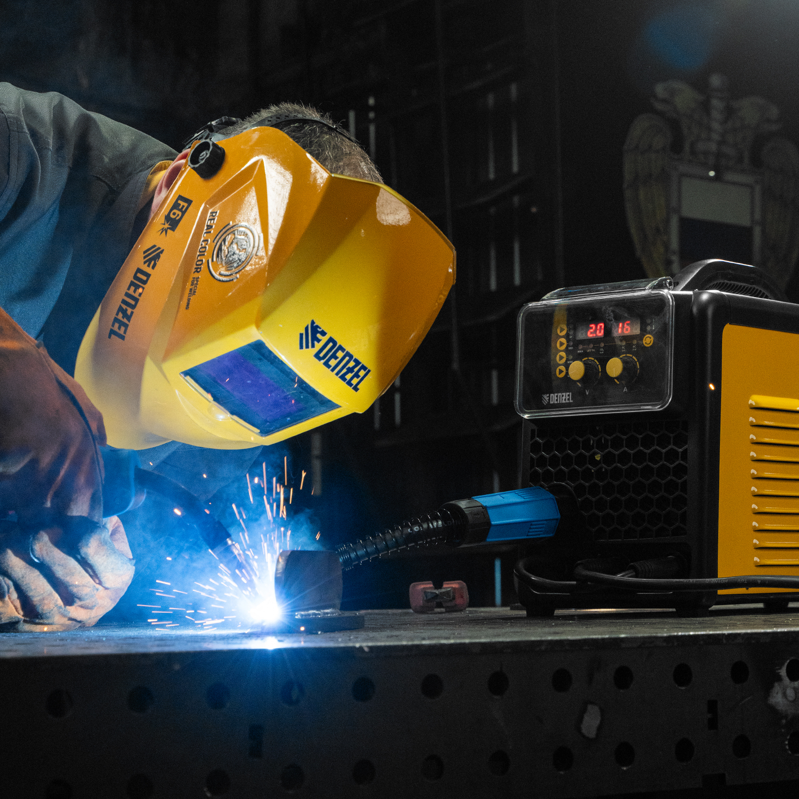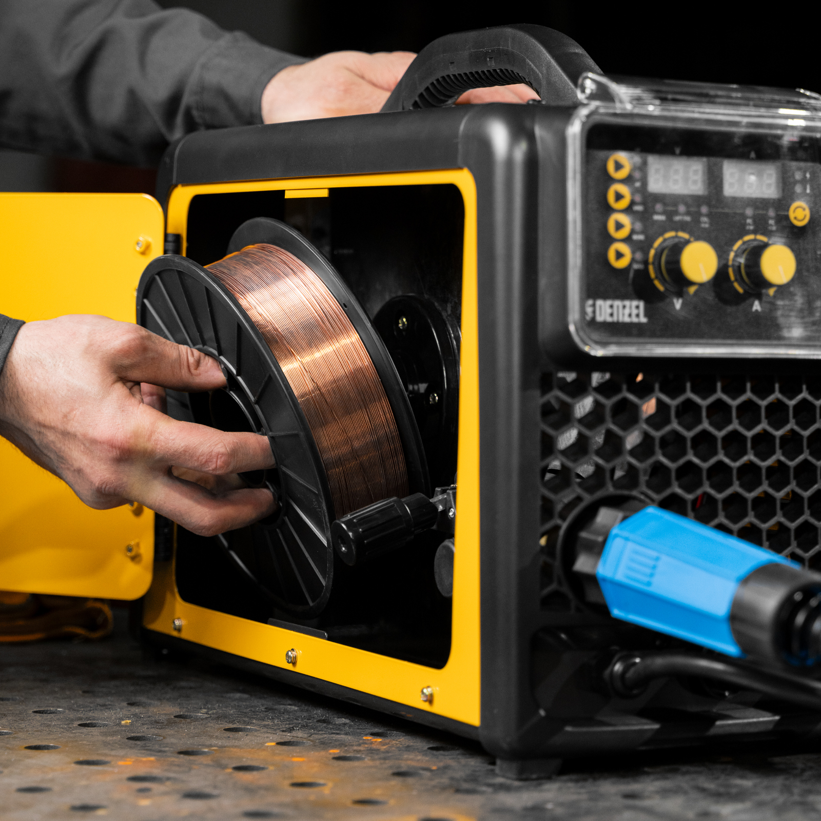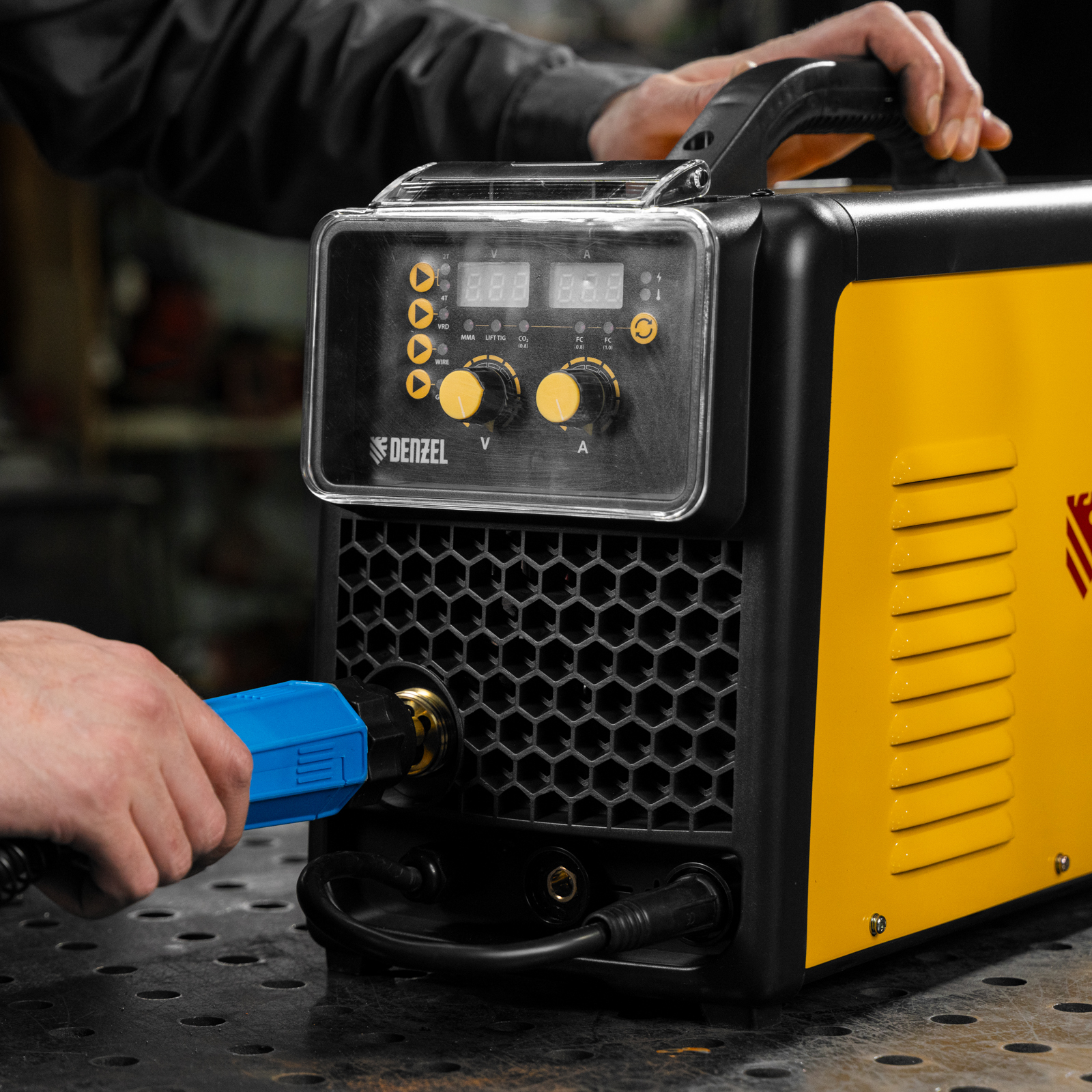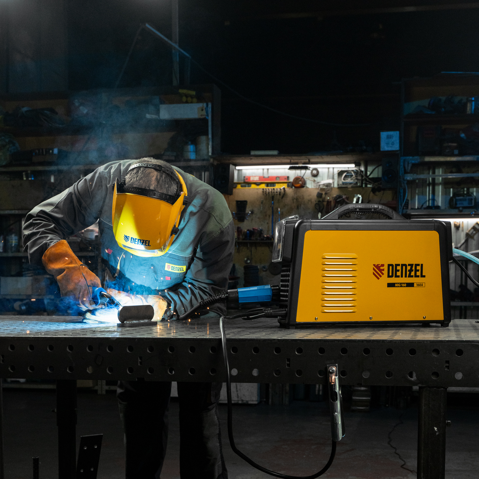 Инверторный аппарат полуавтоматической сварки Denzel MIG-160 94309 совместим с катушками массой до 5 кг, работает со максимальным сварочным током 160 A, продолжительность включения составляет 60%. Возможна сварка в среде защитного газа (MIG), порошковой проволокой (FCAW), аргонодуговая сварка неплавящимся электродом (Lift TIG, горелка приобретается отдельно), а также ручная дуговая сварка покрытым электродом (MMA).