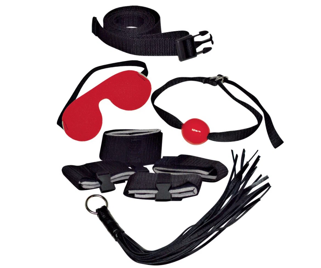 Набор для любителей БДСМ-игр порадует даже искушенных пользователей. Все ремешки регулируются по длине, а значит, подходят для любого размера. В комплекте: манжеты для рук и ног (4 шт, ремень, кляп с шариком, маска на глаза, многохвостовая плетка.
