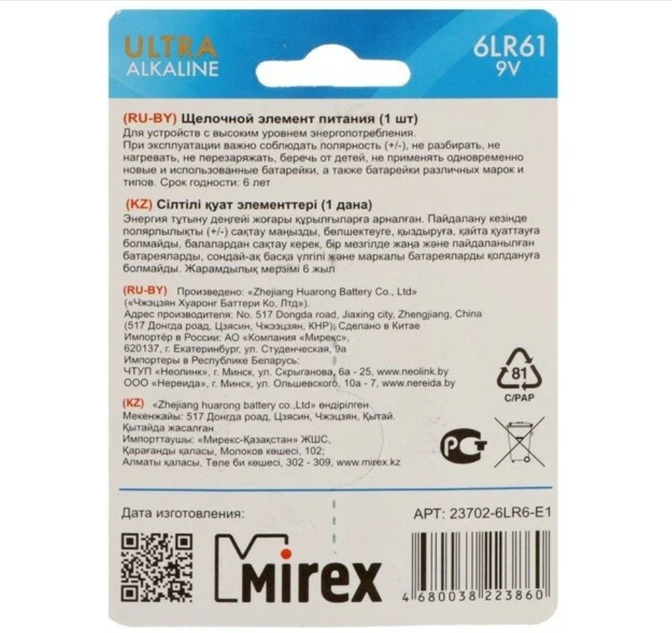 Алкалиновая батарейка Mirex 6LR61-1BL, известная под названием "крона", обеспечивает надёжную работу различных устройств, таких как детские игрушки, портативные радиоприёмники, измерительные приборы и другое оборудование, требующее питания от 9 В. Время работы и эффективность зарядки достигаются благодаря использованию современных алкалиновых технологий. Упаковка блистером гарантирует сохранность батарейки до момента использования. Характеристики: Тип батарейки: 6LR61 (крона) — подходит для множества портативных устройств. Напряжение: 9 В — для обеспечения стабильного питания. Технология: алкалиновая — высокая ёмкость и долговечность. Количество в упаковке: 1 шт. (блистер) — удобно для замены батареи. Упаковка: блистер — защита от внешних воздействий и удобство хранения.