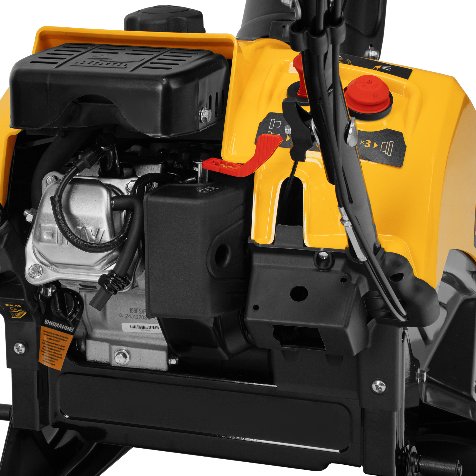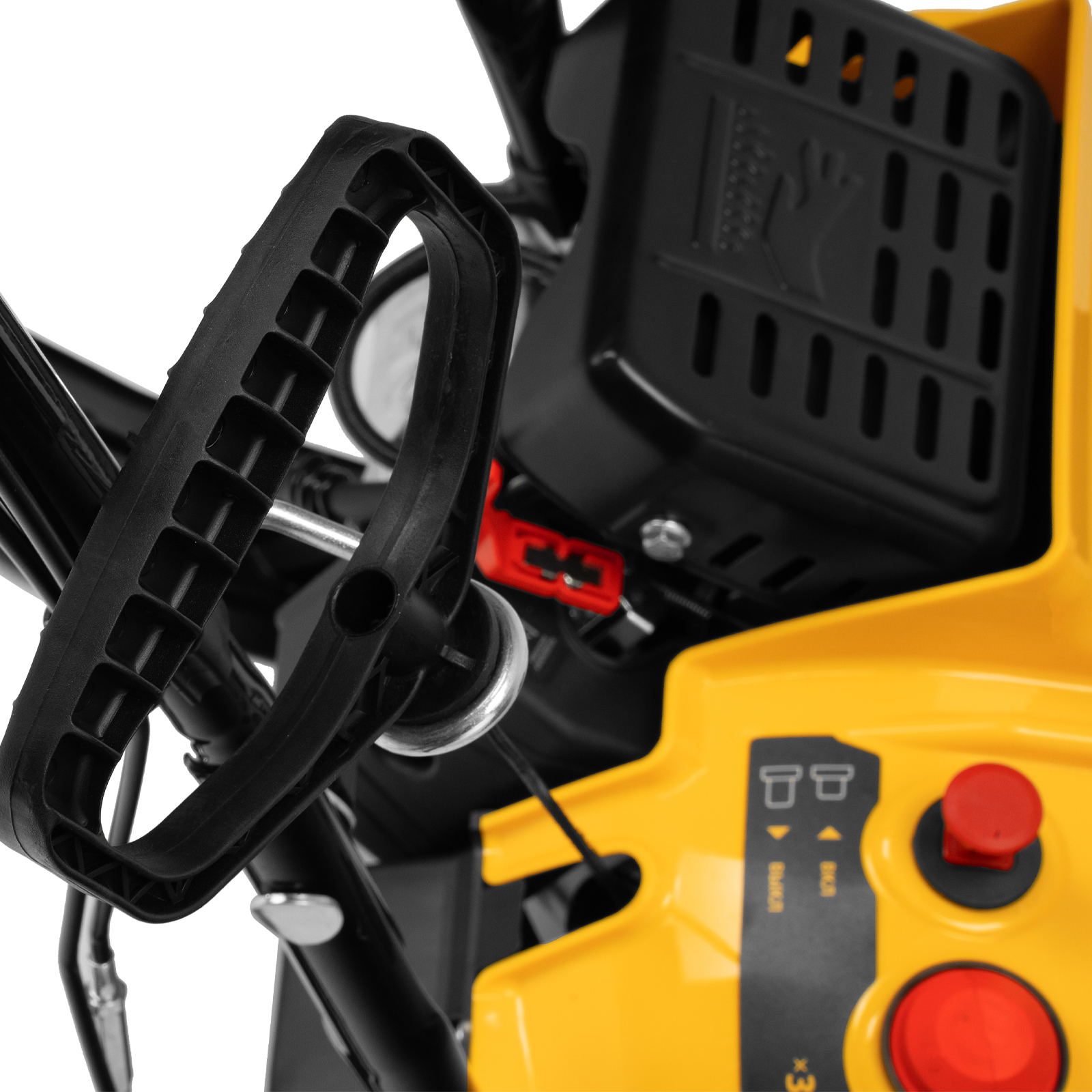 - Эргономичность — широкая рукоятка ручного старта облегчает запуск двигателя, для регулировки угла поворота желоба не нужно наклоняться.