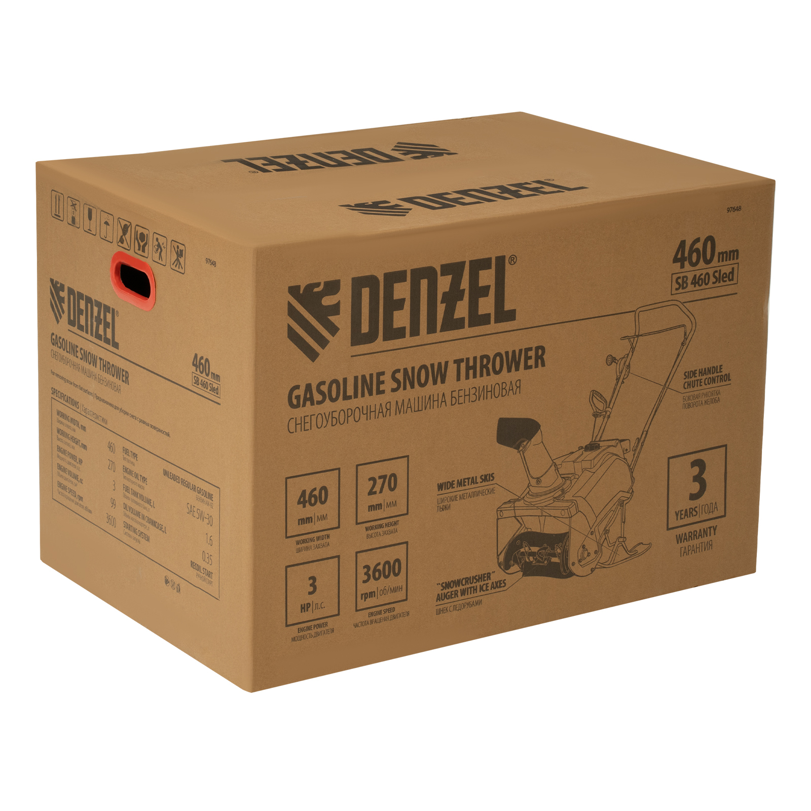 Бензиновая снегоуборочная машина Denzel SB 460 Sled 97648 с двигателем объемом 99 см3, лыжами и ручным стартом, предназначена для работы на открытых ровных поверхностях. Высота захвата составляет 270 мм, ширина — 460 мм, дальность выброса снега достигает 10 м. Машина позволяет быстро и эффективно очистить придомовую территорию, дорожку, тротуар, автомобильную парковку, площадку перед гаражом и т.д.