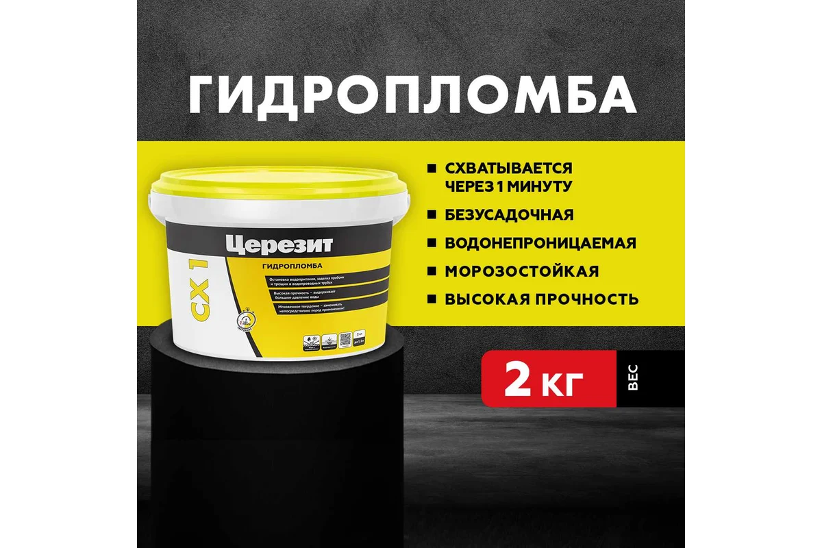 Блиц-цемент гидропломба ЦерезитCX1 2 кг 43458 1910601 предназначена для остановки водопритоков в ограждающих конструкциях, а также для заполнения в них дефектов. Подходит для заделывания пробоин или трещин в водопроводных трубах. Состав начинает схватываться уже через 50 секунд после нанесения и быстро набирает прочность. Через три минуты блиц-цемент полностью затвердевает.