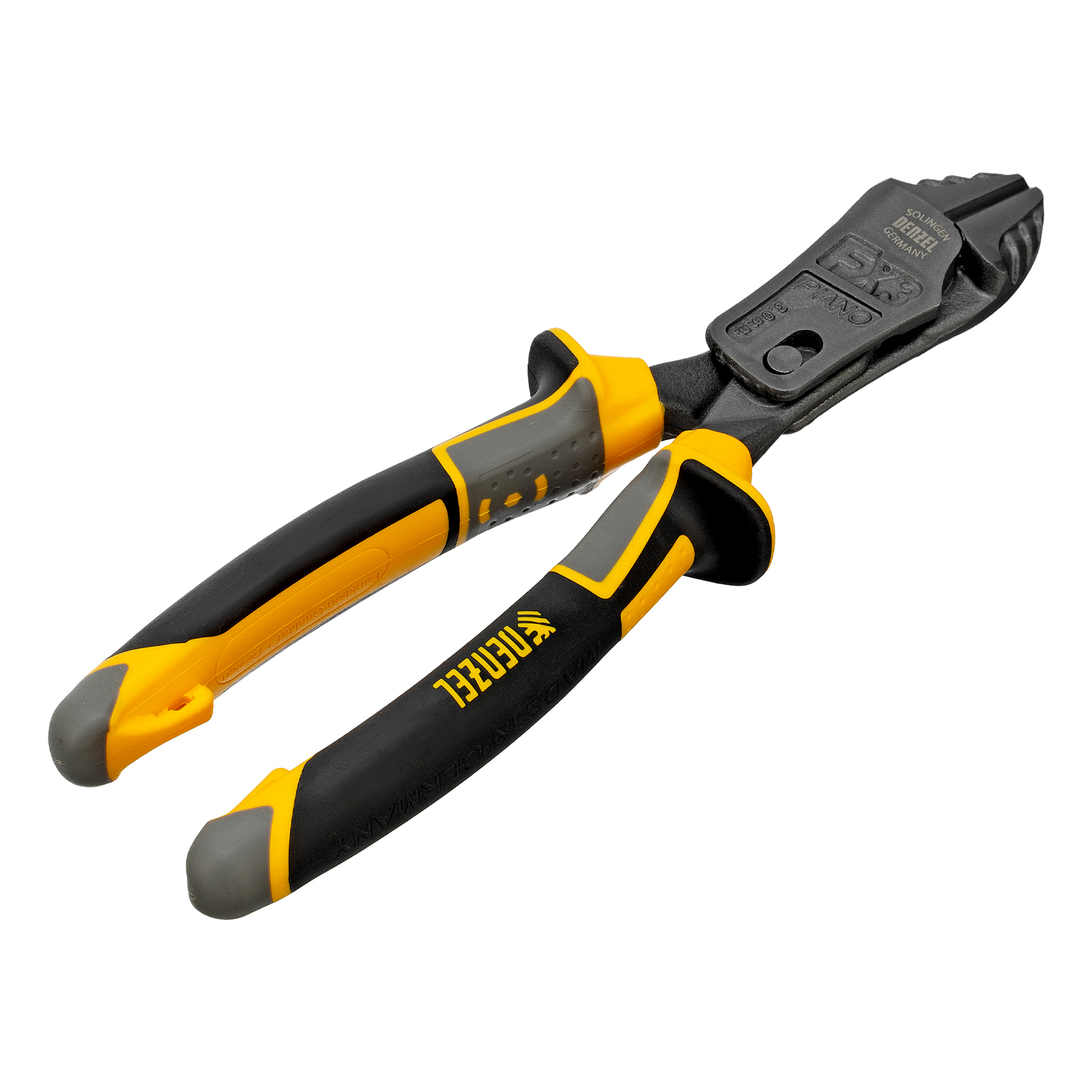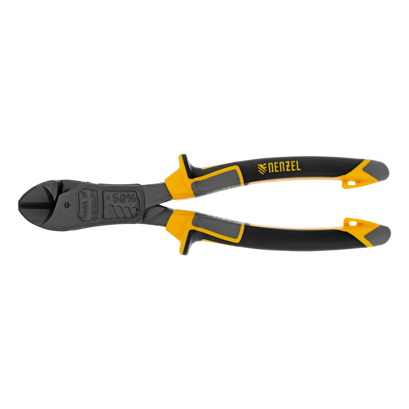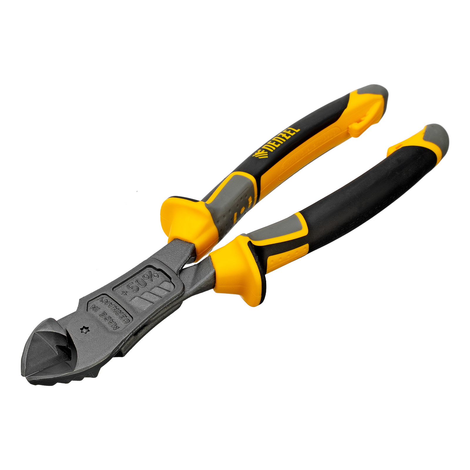 Усиленные бокорезы Denzel 17786 длиной 215 мм, с трехкомпонентными рукоятками, предназначены для разрезания кабелей, проводов, гвоздей и проволоки средней (750 Н/мм2) и высокой жесткости (1800 Н/мм2) диаметром 4,5 и 3,5 мм соответственно. Подходят для резки рояльных струн (предел прочности 2300 Н/мм2) диаметром до 3 мм. Успешно справляются не только с медными, алюминиевыми и пластмассовыми деталями, но и с более жесткими стальными элементами. Встроенный рычажный механизм и смещенный непосредственно к режущим кромкам шарнир увеличивают усилие реза на 50%.