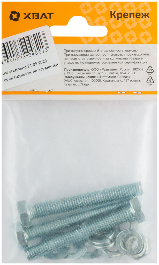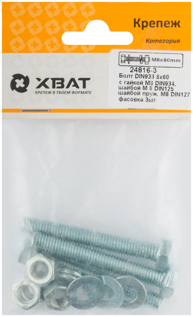Болт 8х60, гайка и шайбы М8 (фасовка 3 шт.)