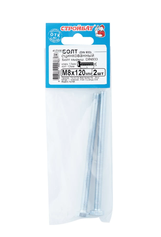 Предназначены для создания разъемного соединения при помощи гайки или резьбового отверстия в одной из соединяемых деталей. Имеют полную резьбу по всему стержню и шестигранную головку под ключ на 13 мм. Цинковое покрытие защищает от коррозии.