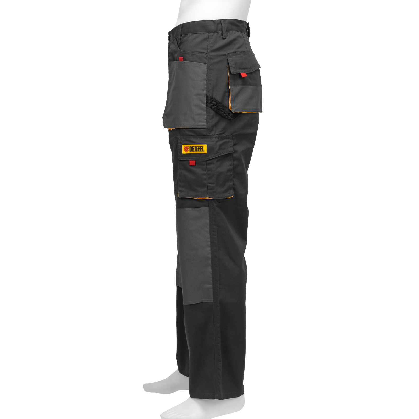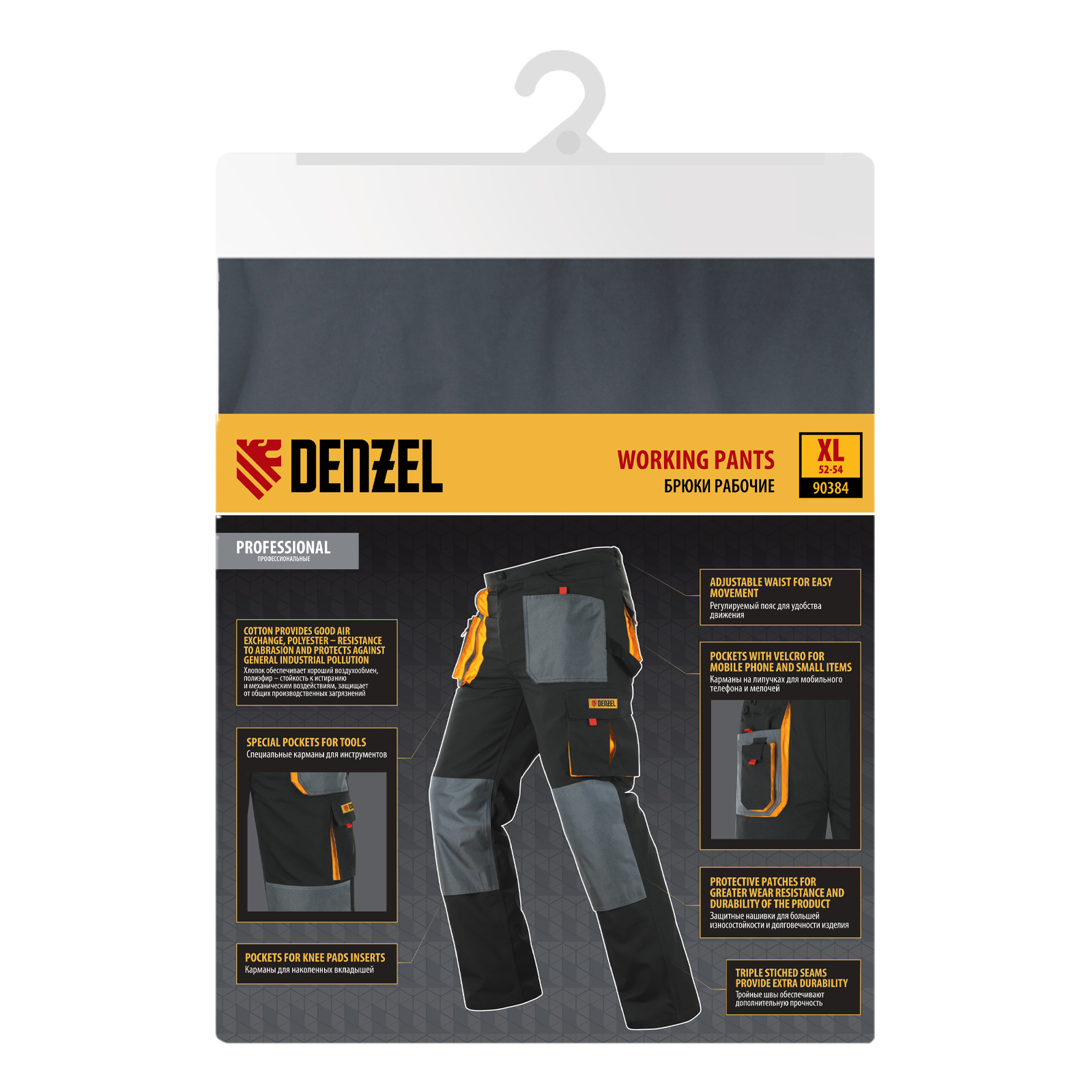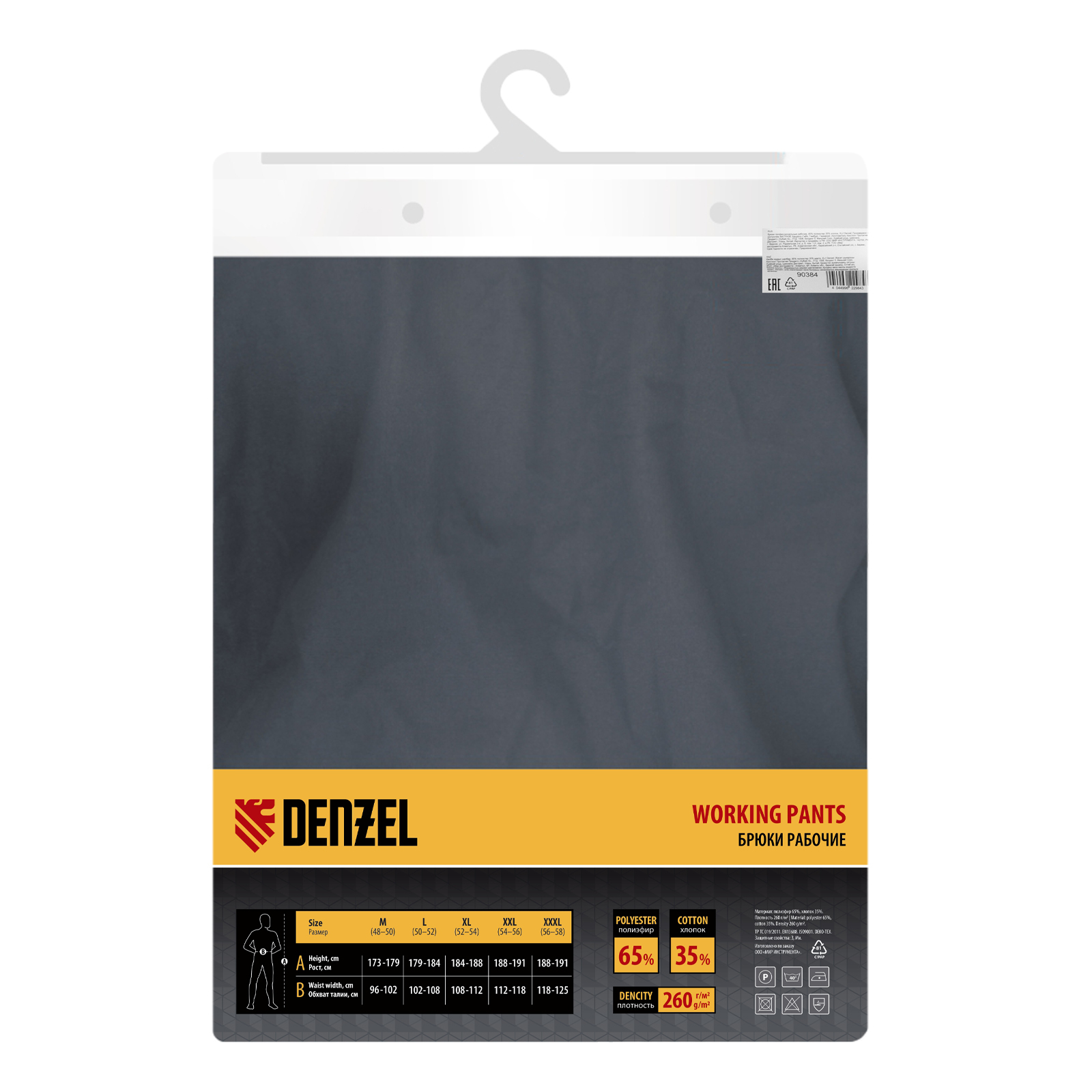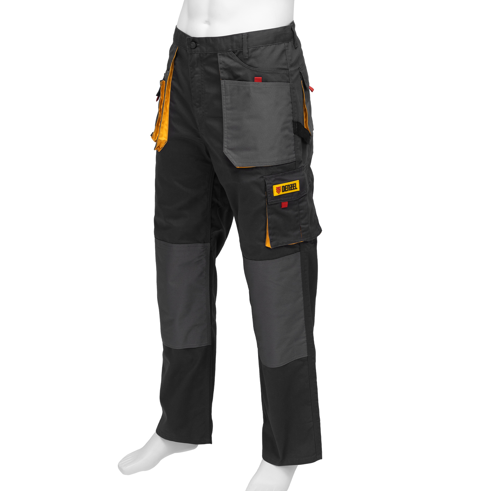 Рабочие брюки Denzel 90384 размера XL рассчитаны на рост 184-188 см и используются для выполнения профессиональных строительных, ремонтных, сантехнических и производственных работ в теплое время года или в отапливаемом помещении. Защищают пользователя от общих производственных загрязнений, нетоксичной пыли, ветра и незначительных механических воздействий. Изготовлены из ткани плотностью 260 г/м² (65% полиэстер, 35% хлопок). За счет наличия хлопковых волокон в составе ткань хорошо пропускает воздух и приятна на теле, полиэстер обеспечивает устойчивость к истиранию. Брюки выполнены в практичном темно-сером цвете.