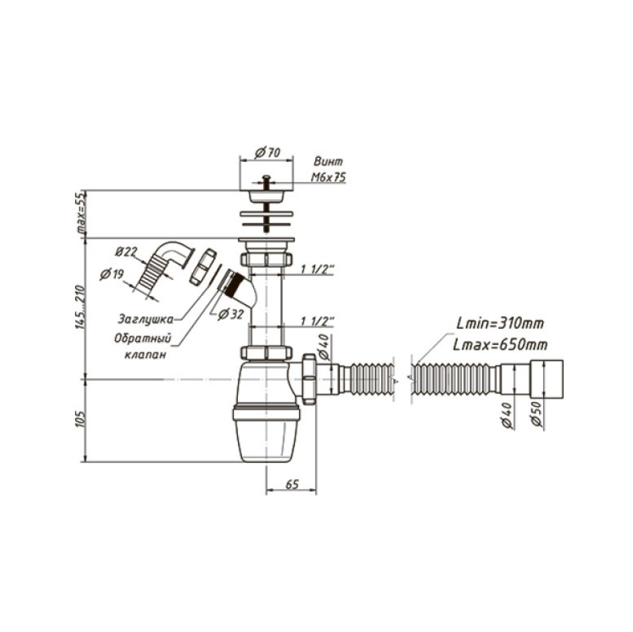 Технические характеристики ORIO 1 1/2x40 с одним отводом и гибкой трубой 40-40/50