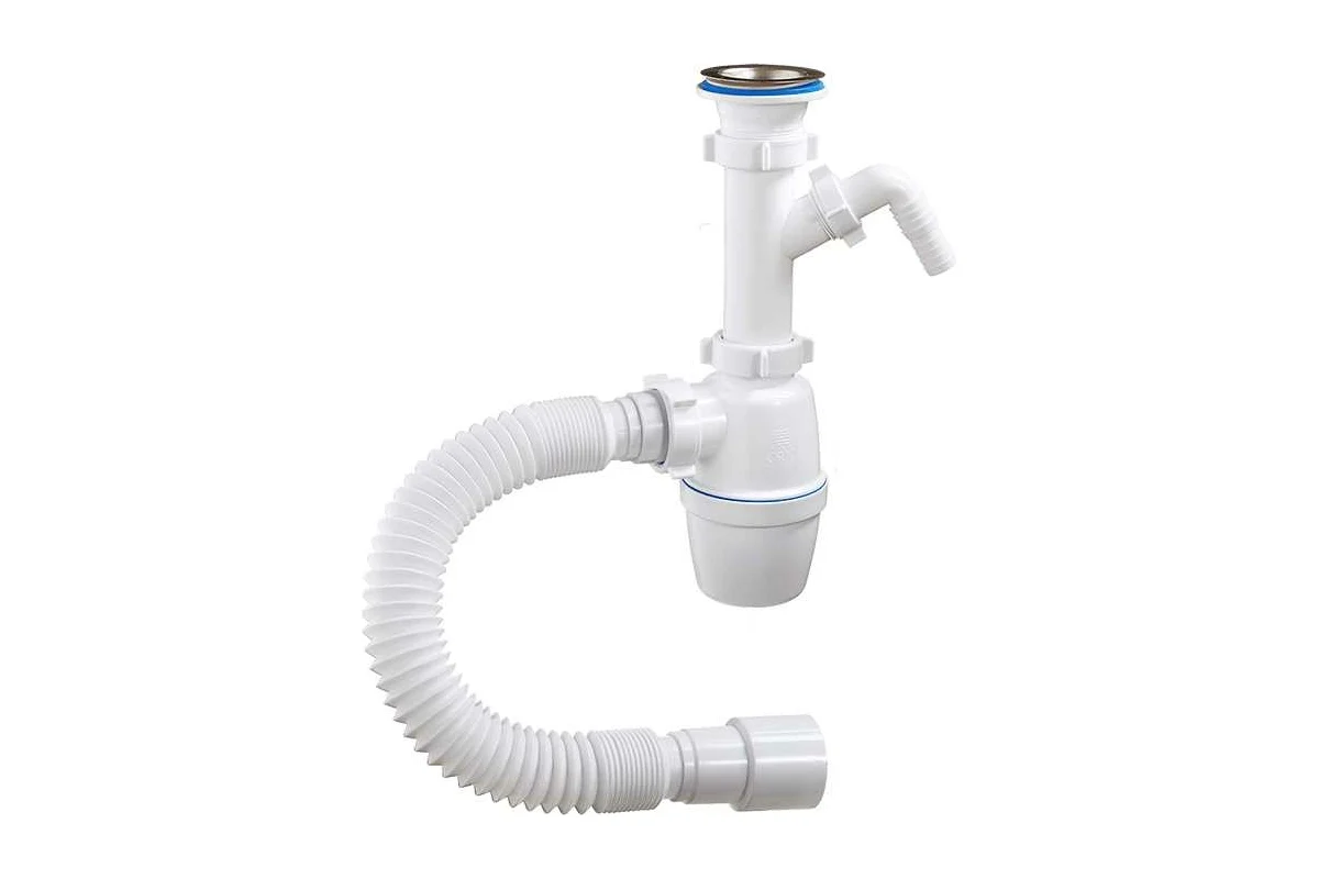 Сифон с большим корпусом и отстойником, выпуском, нержавеющей чашкой D-70мм, отводом для подключения стиральной/посудомоечной машины и отводом в канализацию.