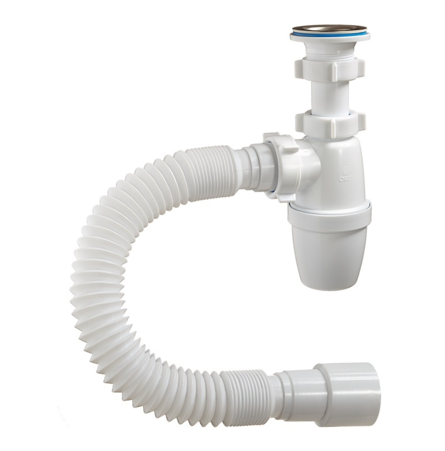 Бутылочный сифон ORIO 1 1/4 40, малый корпус, с гибкой трубой 40-40/50 А-3202 с отстойником для умывальника, выпуском с нержавеющей чашкой д.63мм и отводом в канализацию гибкой трубой 40-40/50. В комплекте идёт полированная нержавеющая чашка д.63мм. Сифон комплектуется нержавеющим винтом длиной 75мм и нержавеющей гайкой. Длина отвода в канализацию от 310 до 650мм. Отвод имеет два диаметра подключения к канализации 40 и 50мм.