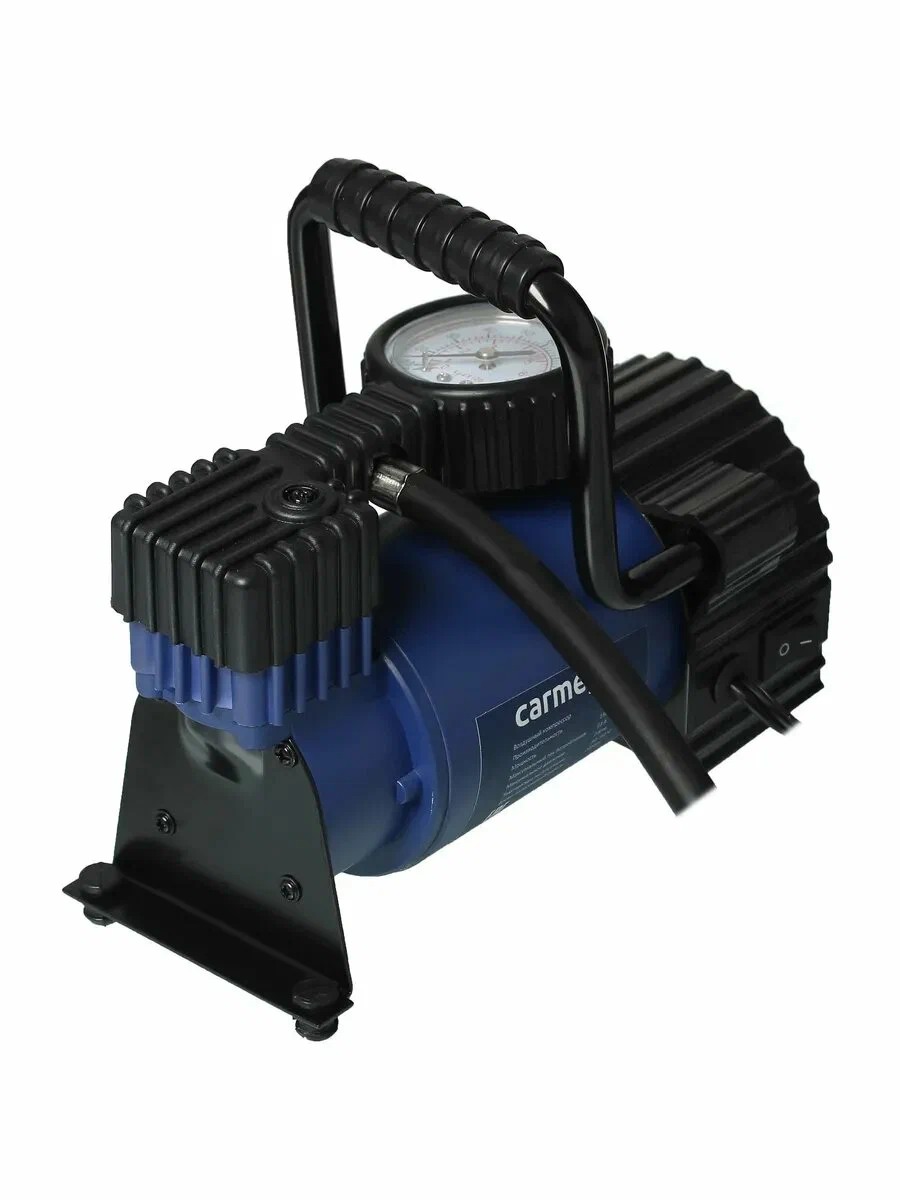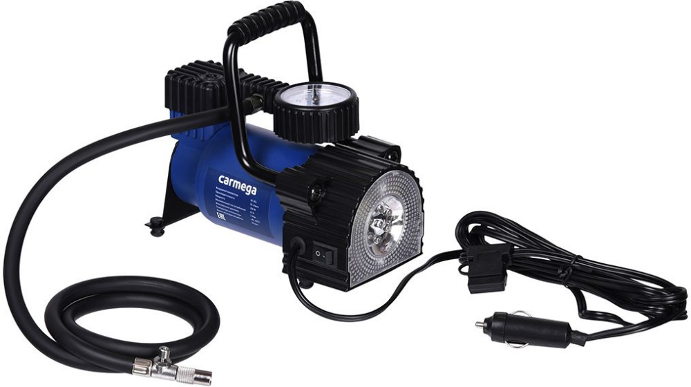 Компрессор для шин Carmega AC-35L в прочном металлическом корпусе идет в комплекте с 3 насадками и плотным чехлом. Модель оснащена предохранителем 15 А и надежной защитой от перегрева. Встроенный фонарь упрощает работу на ночной трассе.