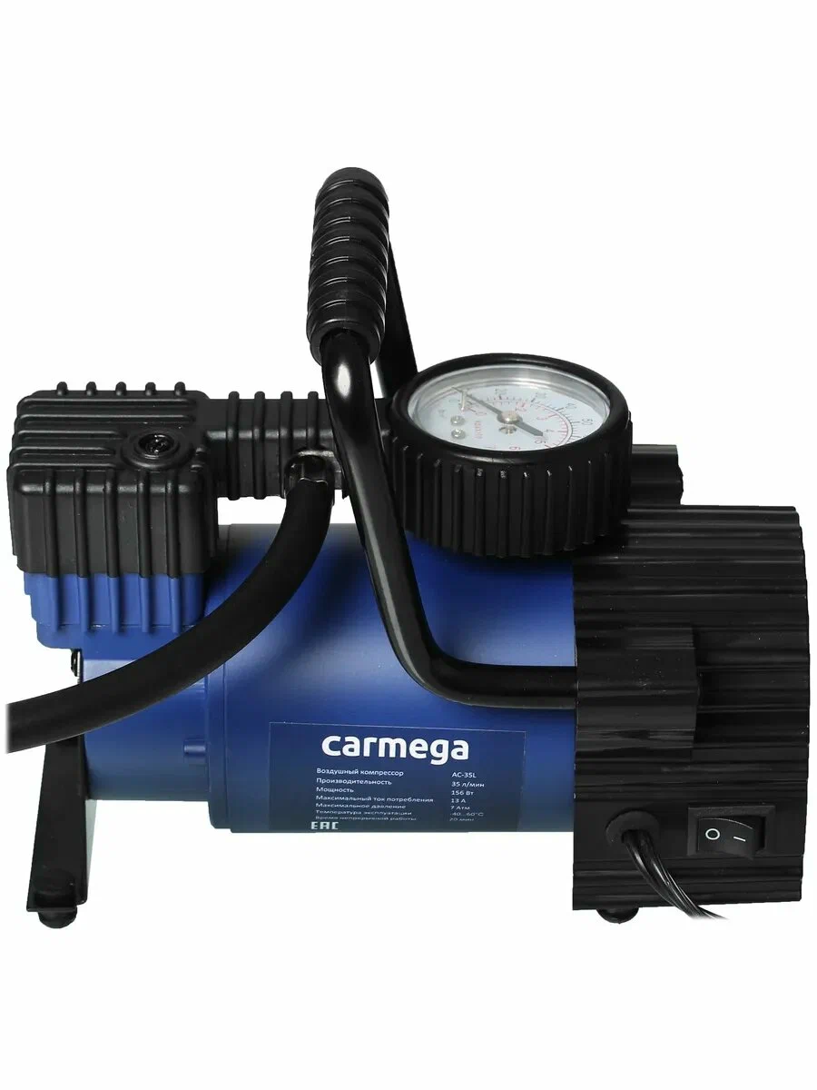 Carmega AC-35L подключается к прикуривателю авто, действует с напряжением 12 В. Компрессор нагнетает давление 7 атм, действует со скоростью 35 л/мин. На корпусе есть спускной клапан и аналоговый манометр с 2 шкалами BAR и PSI для контролирования процесса накачивания шин. Прочная конструкция выдерживает непрерывную работу в течение 20 минут при температуре от -40 °C до +60 °C.
