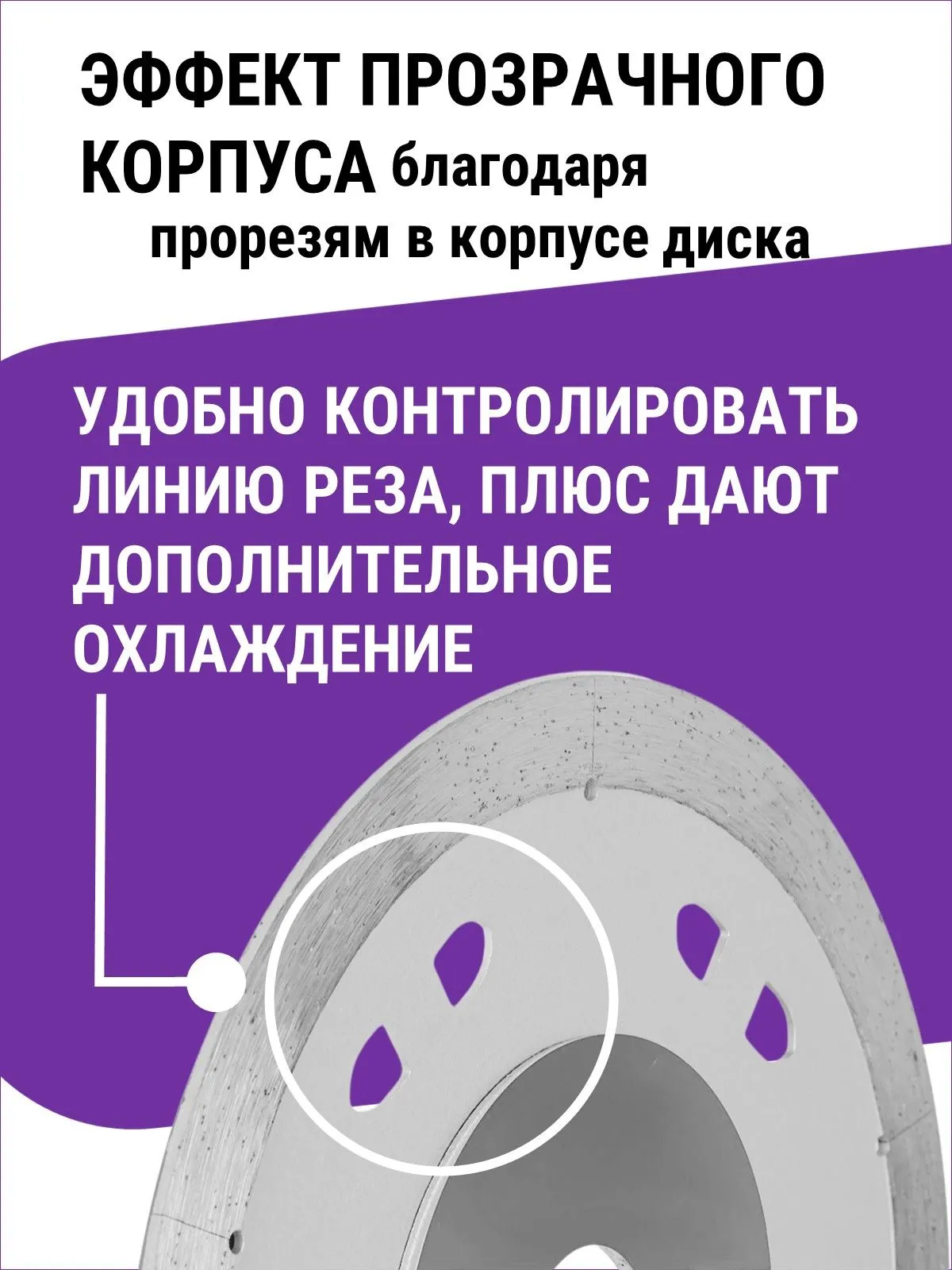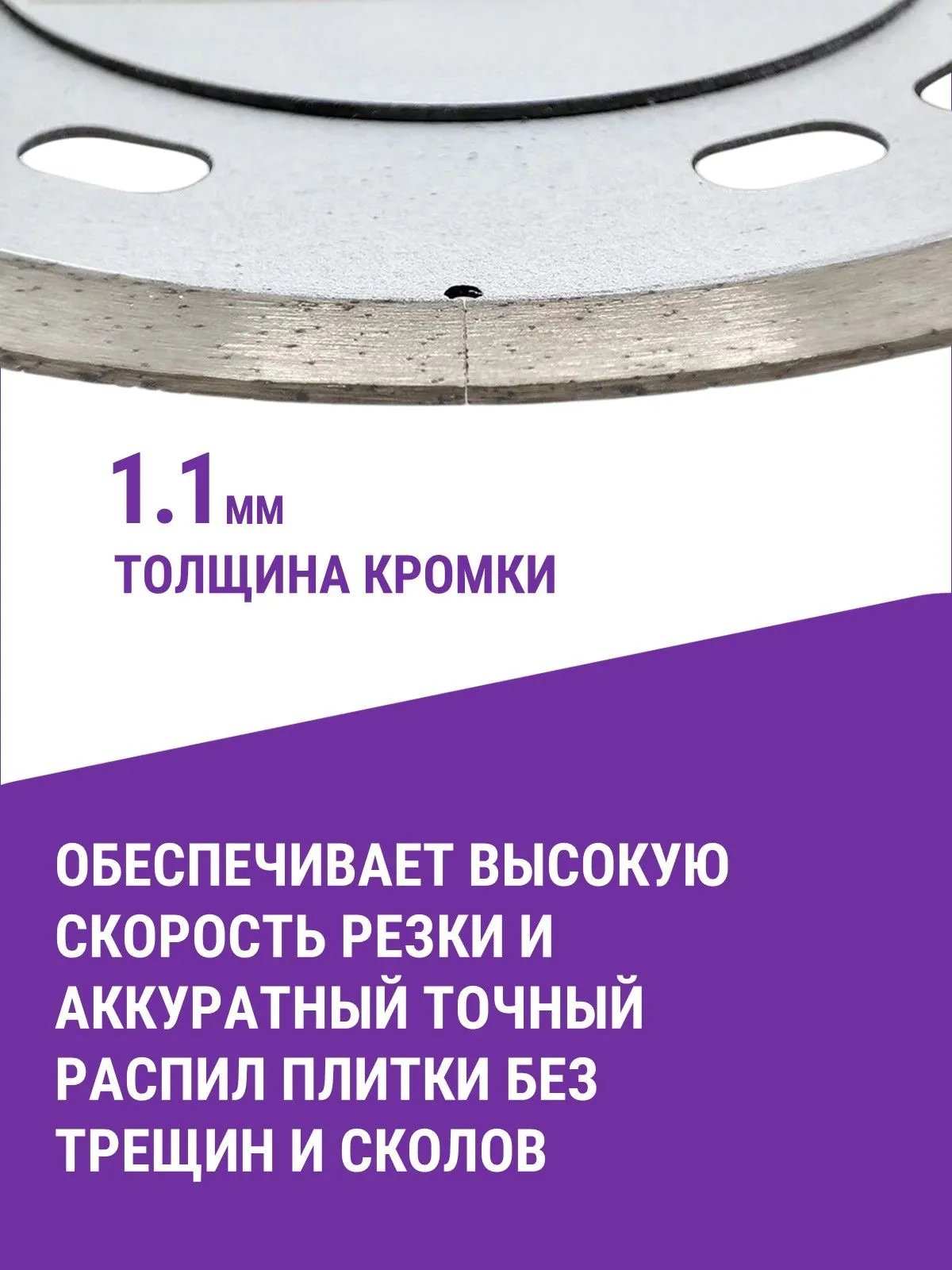 Этот алмазный диск — идеальный выбор для тех, кто ценит точность и качество реза. Благодаря ультра-тонкой конструкции (толщина всего 1.1 мм) он обеспечивает аккуратный и чистый рез без сколов, что особенно важно при работе с керамической плиткой и керамогранитом.