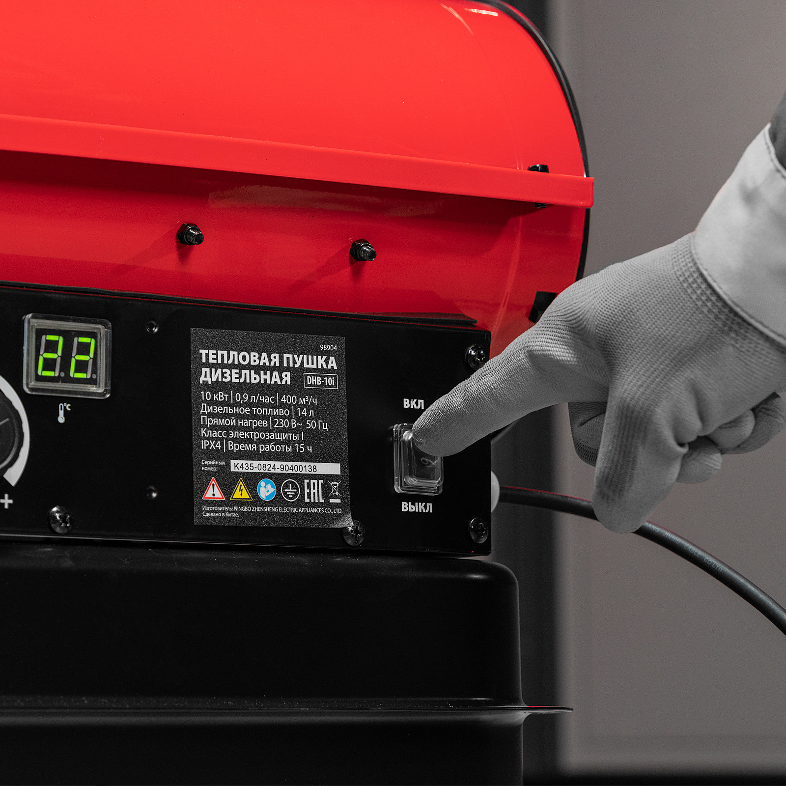 Дизельная тепловая пушка MTX DHB-10i 98904 тепловой мощностью 10 кВт и производительностью 400 м3/ч, с прямым типом нагрева и термостатом, предназначена для обогрева складов, цехов, теплиц и других нежилых помещений. Также используется на производстве и в строительстве: для прогрева бетона, просушки стен и разморозки траншей.