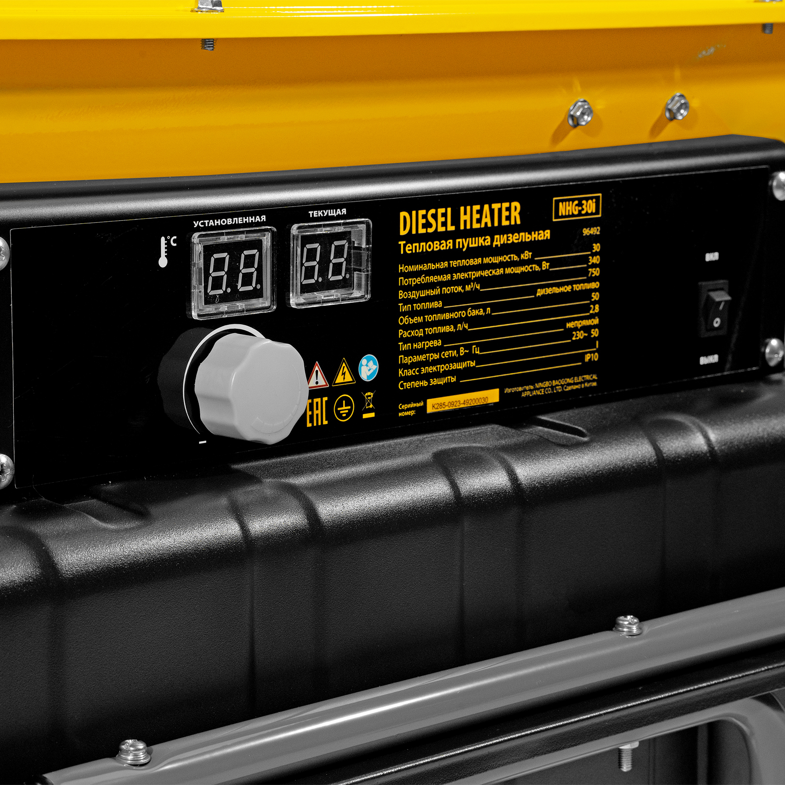Дизельная тепловая пушка непрямого нагрева DENZEL NHG-30i 96492 с цифровым термостатом обладает тепловой мощностью 30 кВт и генерирует поток теплого воздуха 750 м3/ч. Предназначена для обогрева шатров, палаток, складов, а также технических помещений, ангаров, теплиц и строительных объектов. В работе пушки используется схема непрямого нагрева: при помощи отводного патрубка продукты горения можно полностью вывести за пределы помещения. Такое решение позволяет использовать устройство в присутствии людей.