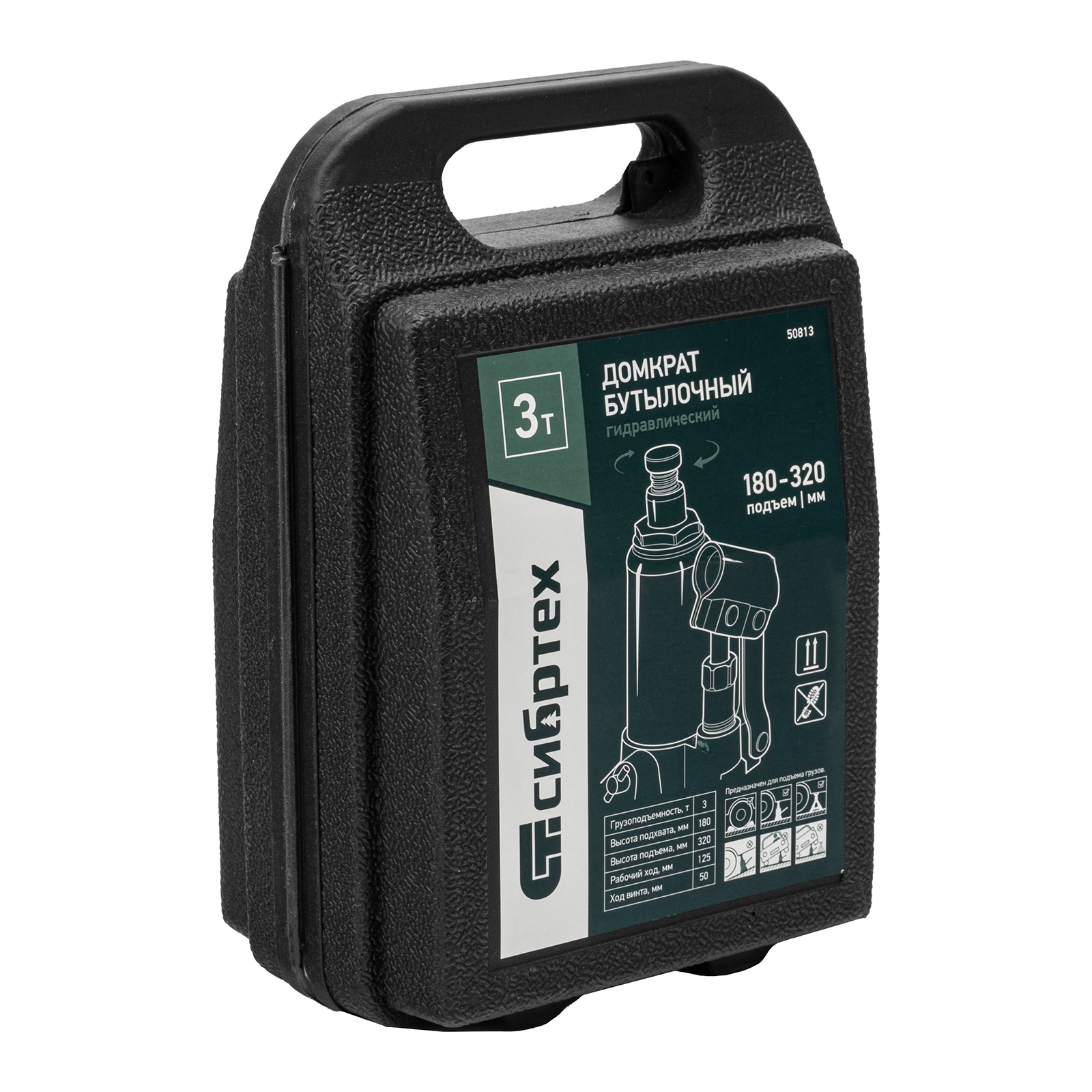 Домкрат гидравлический бутылочный Сибртех 50813, поставляющийся в пластиковом кейсе, предназначен для подъема грузов массой до 3 т на высоту от 180 до 320 мм. Не требует больших усилий от пользователя и значительно облегчает рабочий процесс. Домкрат будет полезен при проведении техобслуживания машины в автосервисе или гараже.