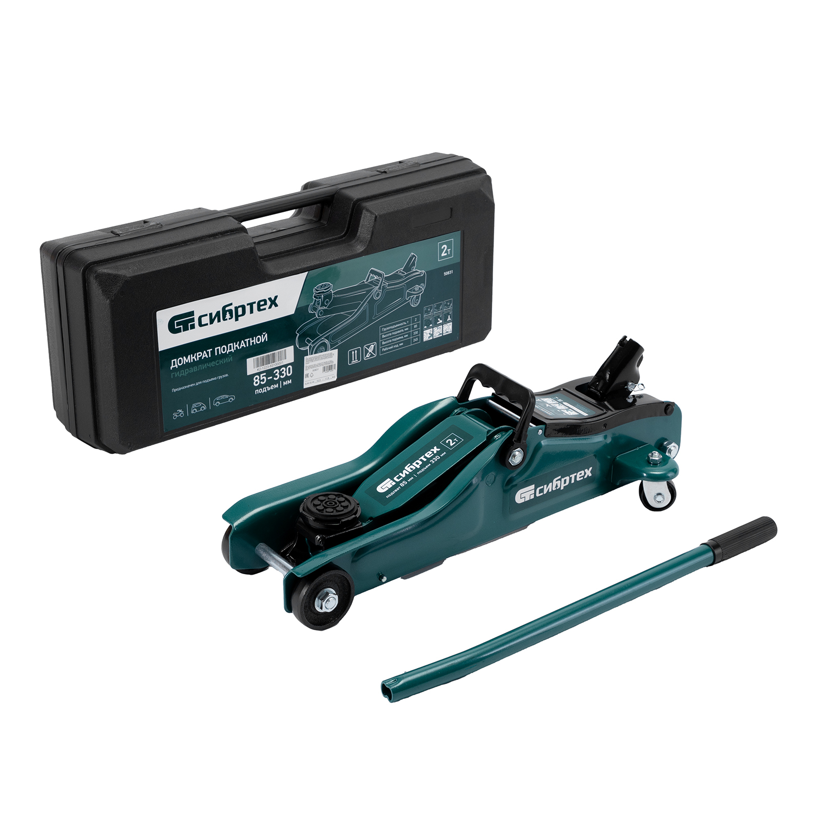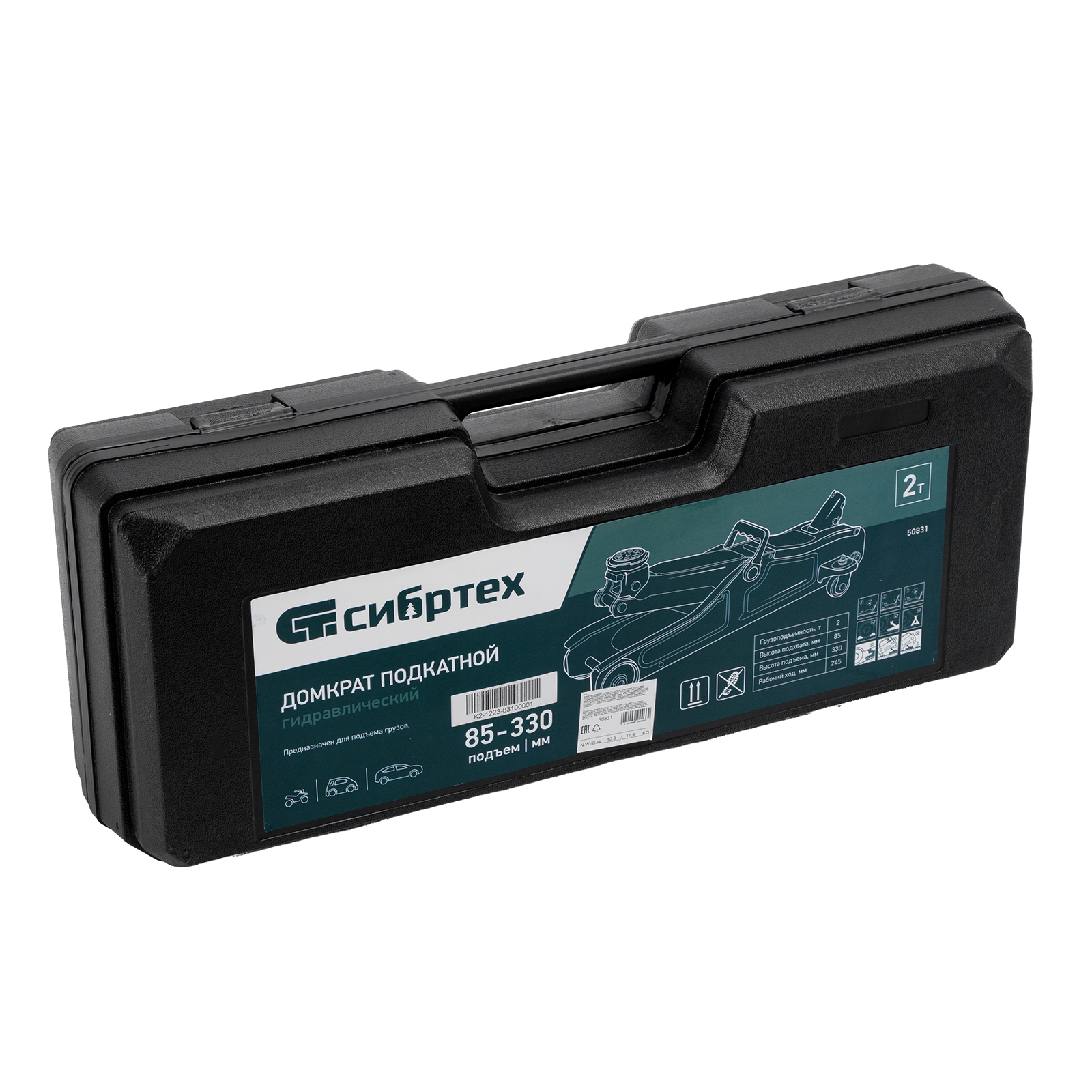 Гидравлический подкатной домкрат Сибртех 50831, поставляющийся в пластиковом кейсе, с высотой подхвата 85 мм, предназначен для подъема грузов массой до 2 т на высоту до 330 мм. Применяется для обслуживания автомобилей с низким клиренсом. Компактный домкрат подходит для самостоятельного использования автовладельцами.