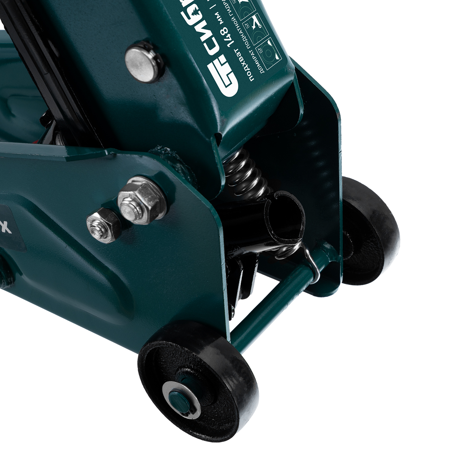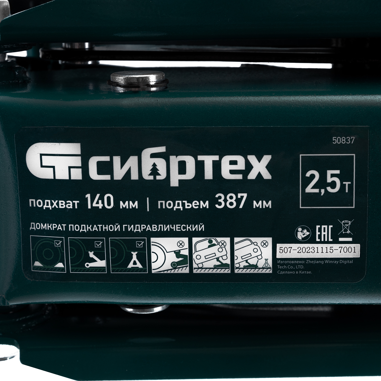 Гидравлический подкатной домкрат Сибртех 50837, поставляющийся в пластиковом кейсе, с высотой подхвата 148 мм, предназначен для подъема грузов массой до 2,5 т на высоту до 387 мм. Применяется для обслуживания автомобилей со стандартным клиренсом. Компактный домкрат подходит для самостоятельного использования автовладельцами.