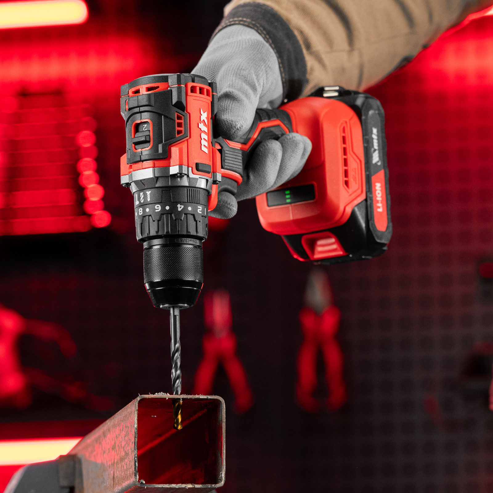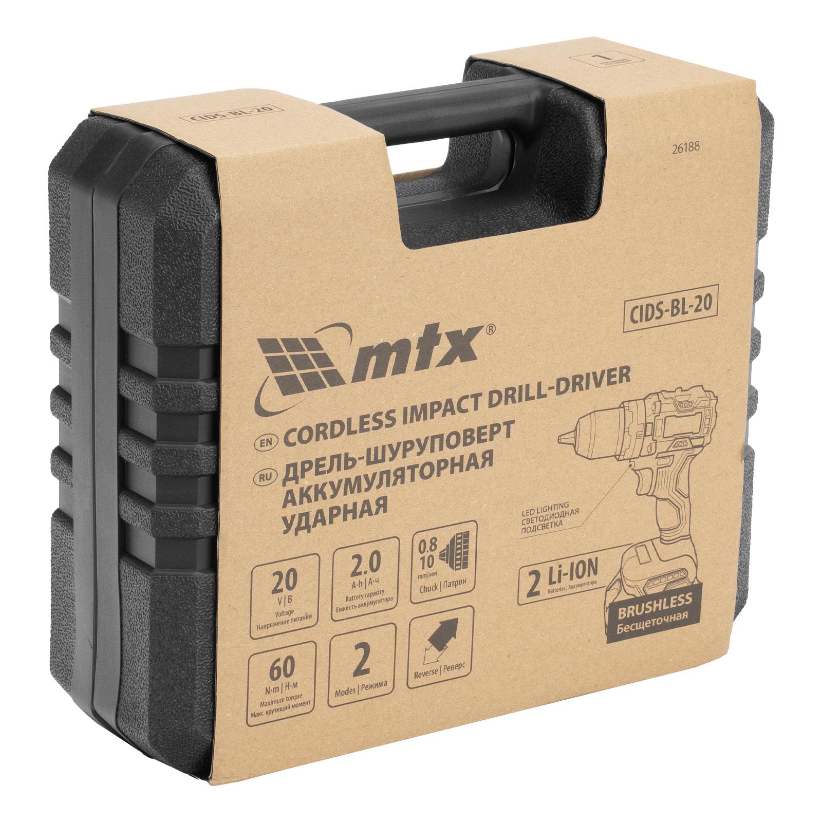 Аккумуляторная ударная дрель-шуруповерт MTX CIDS-BL-20 26188 работает от аккумулятора Li-Ion 20 В емкостью 2 А·ч и предназначена для закручивания и откручивания винтов, саморезов, шурупов, а также сверления отверстий диаметром до 25 мм в древесине и до 10 мм — в металле и бетоне. Ударный механизм позволяет справляться с твердыми материалами, такими как кирпич и бетон. В патрон устанавливается оснастка с диаметром хвостовика 0,8-10 мм. Максимальный крутящий момент составляет 60 Н·м (предусмотрена 20+1 ступень регулировки), что позволяет затягивать крепеж с необходимым усилием.
