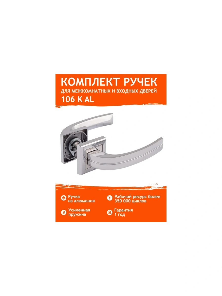 Дверные ручки для дверей изготовлены из литого алюминия и покрыты гальваническим способом в пять слоев, чем защищает ручку от воздействия влаги и механических повреждений, и обеспечивает долговечность и безупречный вид на долгие годы. Ручка межкомнатная имеет ресурс не менее 350 000 рабочих циклов. Комплект ручек для дверей предназначен для установки на деревянные и металлические двери толщиной от 35 до 45мм. Гарантия на дверные межкомнатные ручки составляет 1 год.