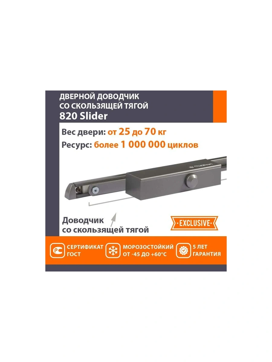 Дверной доводчик НОРА-М 820 Slider скользящая тяга, для дверей до 70 кг, графит 18835 - морозостойкий доводчик со скользящей тягой для дверей весом от 25 до 70 кг с широким диапазоном рабочей температуры от -45 до +60 градусов по Цельсию.