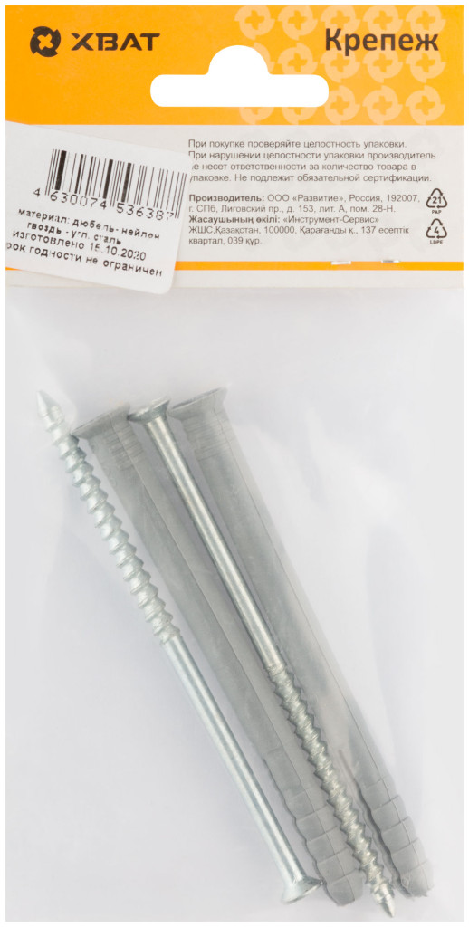Дюбель с потайным бортиком, шуруп с потайной головкой. Дюбель изготовлен из полипропилена, шуруп - из стали с