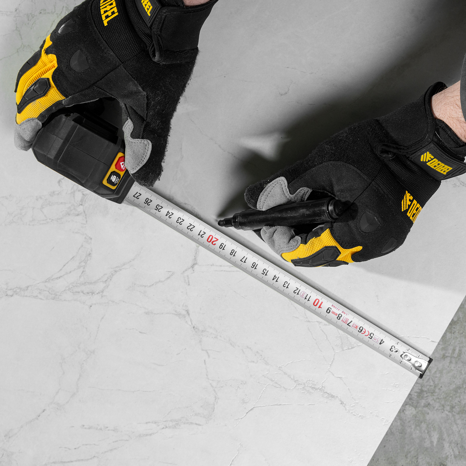 - Надежность и долговечность — корпус выполнен из ударопрочного ABS-пластика и обрезинен для защиты от случайных падений, на полотно рулетки нанесено износостойкое нейлоновое покрытие.