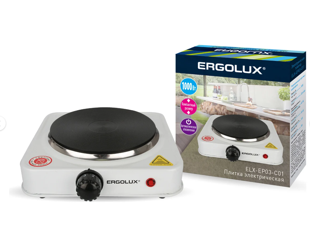 Электроплитка Ergolux ELX-EP03-C01 13438 удобна и проста в эксплуатации. Имеет дисковый нагреватель и индикатор включенного состояния. Оснащена регулятором температуры. Незаменима в тех местах, где нет возможности пользоваться бытовым газом.