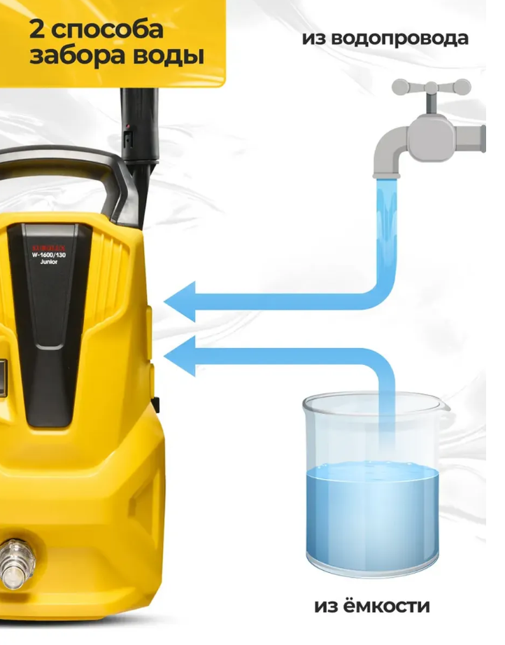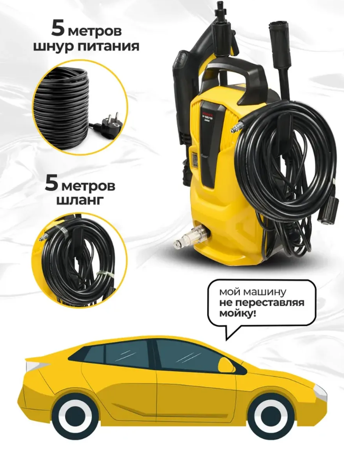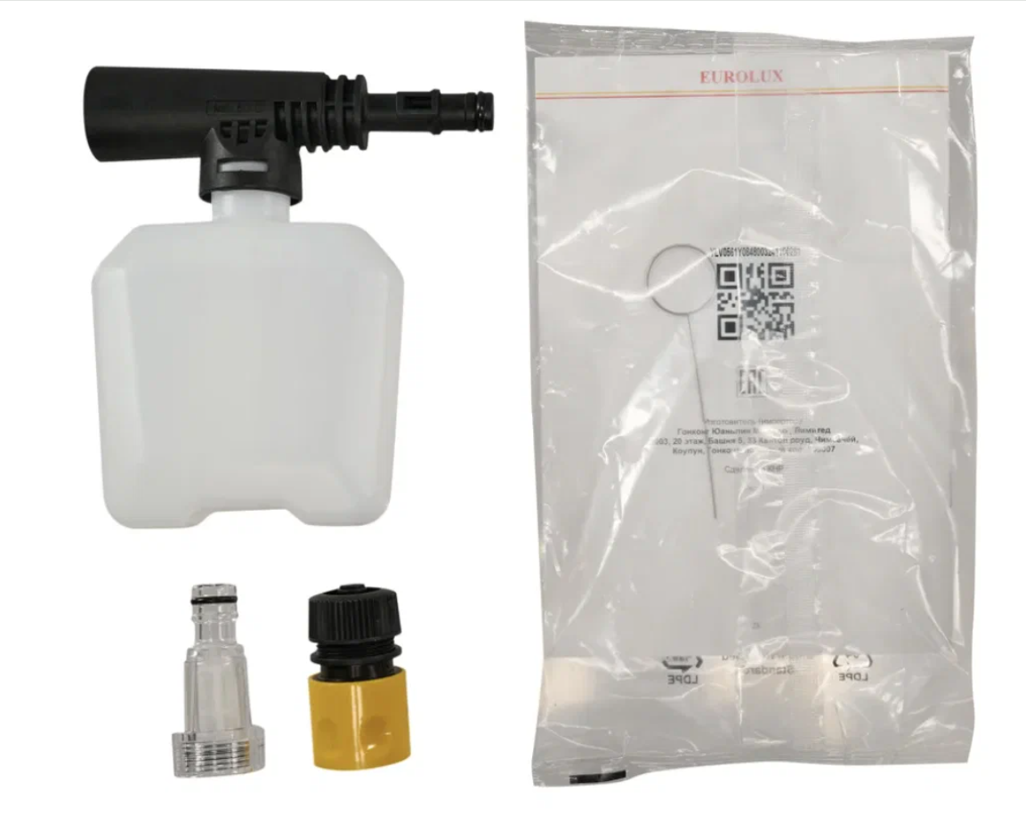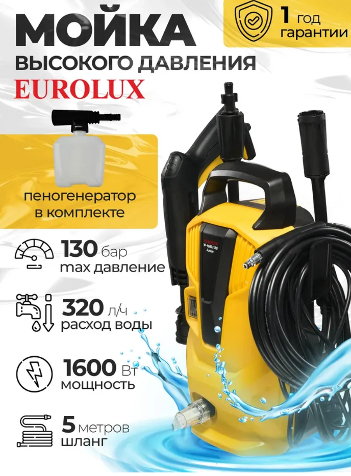 Мойка высокого давления Eurolux W-1600 мощностью 1600 Вт с пеногенератором поможет поддерживать в чистоте автомашину, мотоцикл, дачную мототехнику, инвентарь, дорожки, фасады.