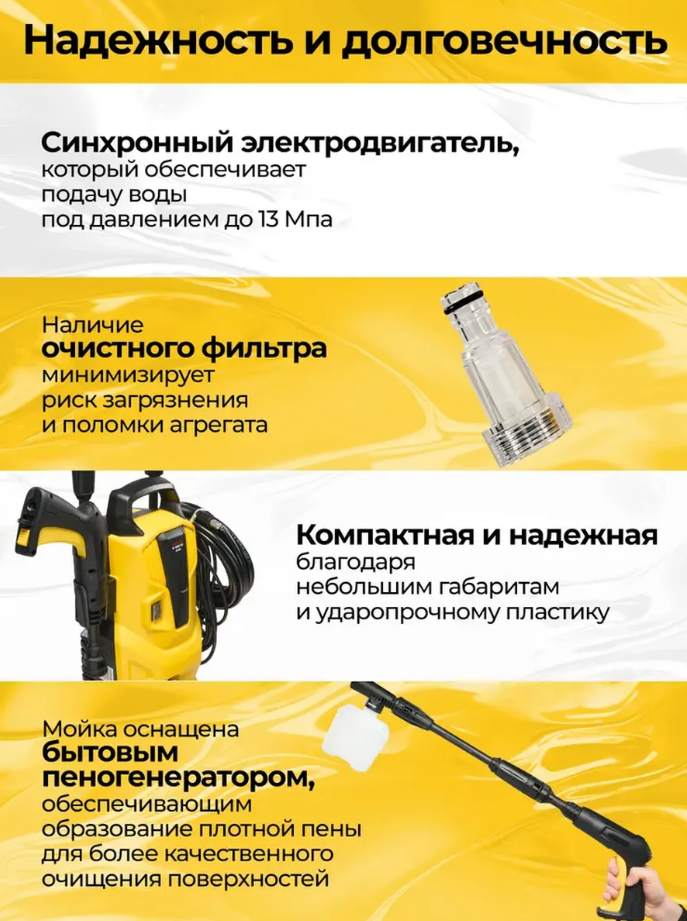 Мойка высокого давления — 1 шт; Пистолет-распылитель разборный — 1 шт; Шланг высокого давления — 1 шт; Пеногенератор (в зависимости от модели) — 1 шт; Игла для очистки сопла - 1 шт; Сменные форсунки (в зависимости от модели) - 1 шт; фильтр - 1 шт; Быстросъёмный коннектор для шланга подачи воды - 1 шт; руководство по эксплуатации.
