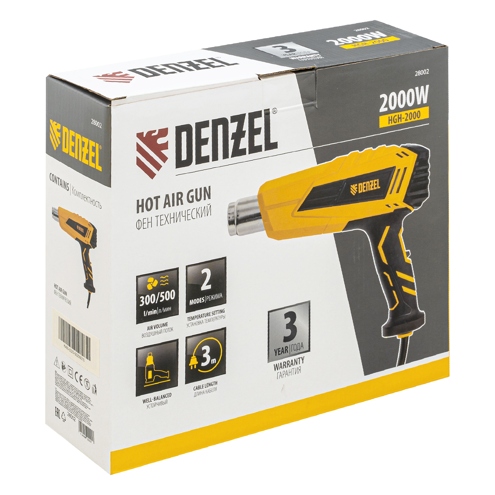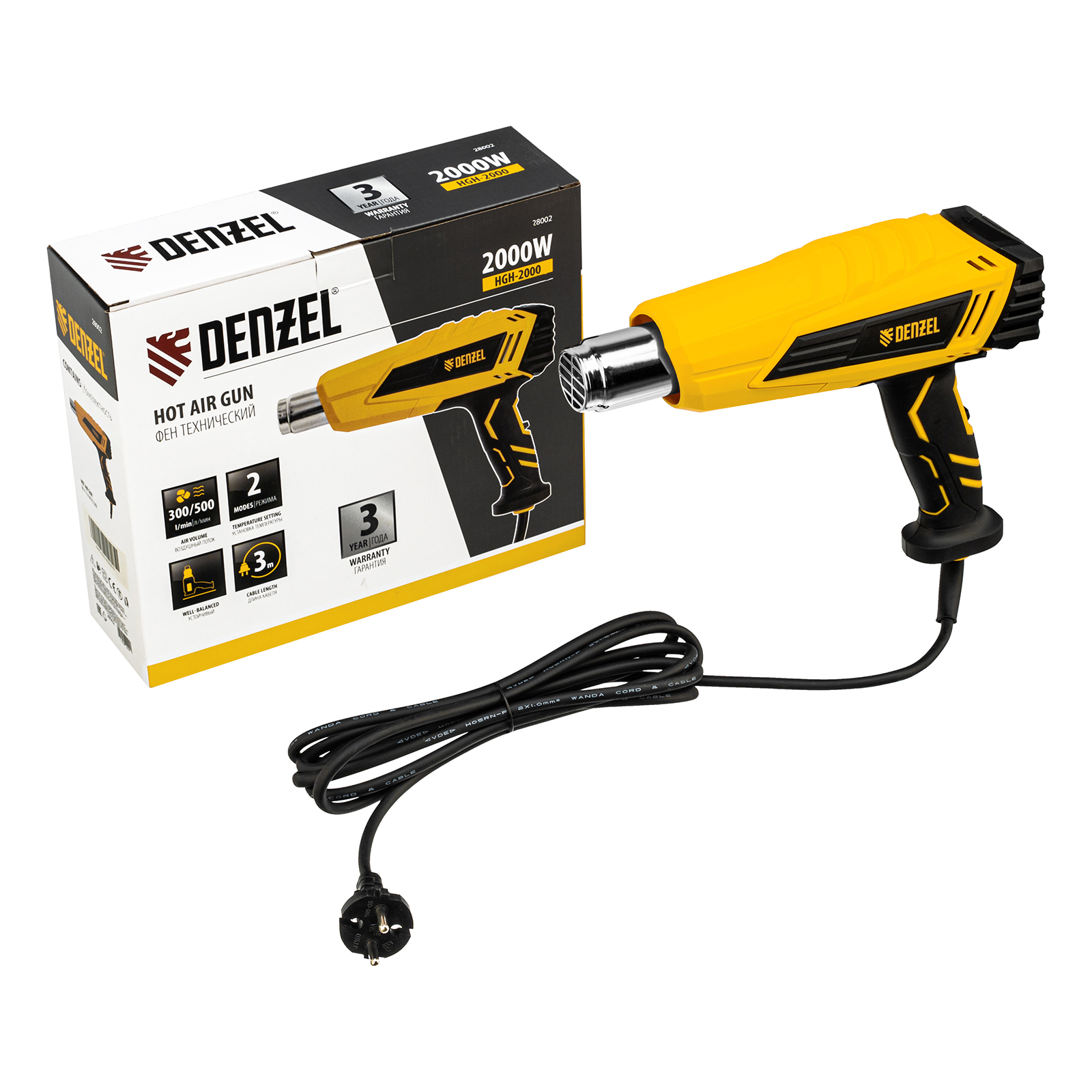 Фен технический Denzel HGH-2000 28002 мощностью 2000 Вт поддерживает 2 режима работы, обеспечивая стабильную производительность на уровне 300 или 500 л/мин. В зависимости от выбранного режима рабочая температура составляет 350 °C или 600 °C. Фен позволяет просушивать и снимать лакокрасочные покрытия, производить сварку пластиковых изделий, паять и размораживать трубы, проводить дезинфекцию поверхностей с помощью потока горячего воздуха, а также решать множество других задач.