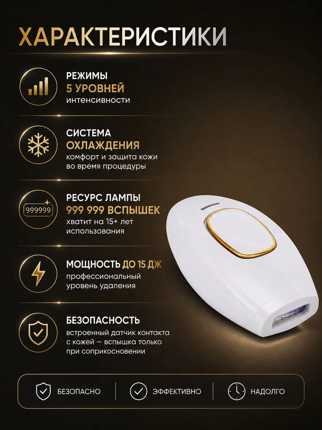 Встроенная система охлаждения защищает кожу от перегрева и делает процедуру максимально комфортной даже на чувствительных участках.