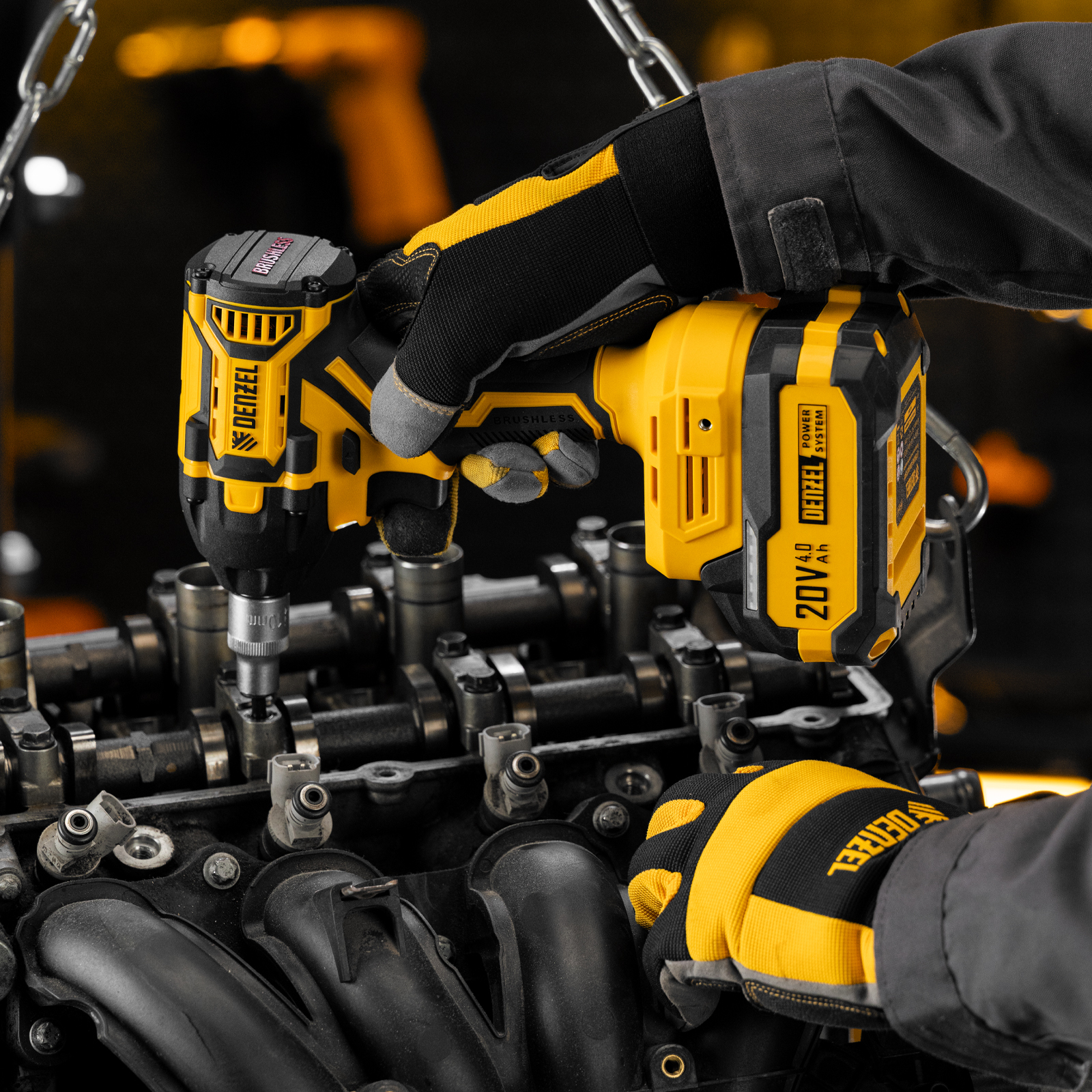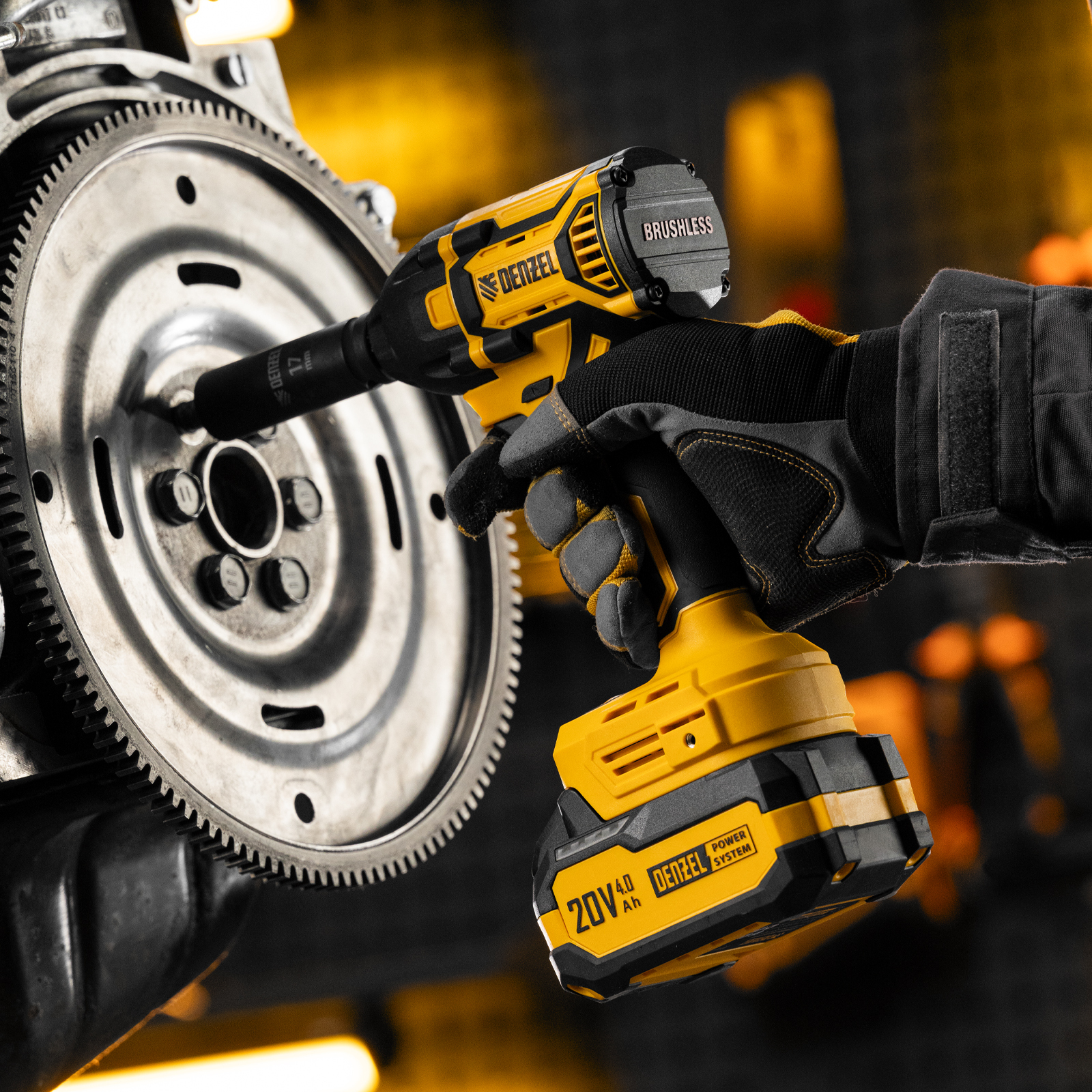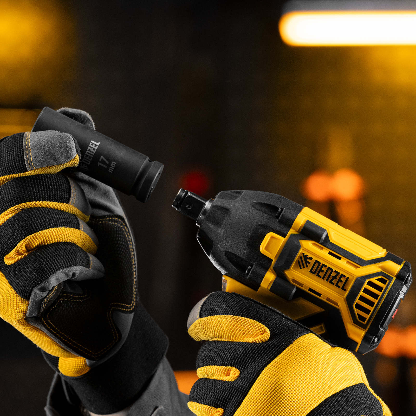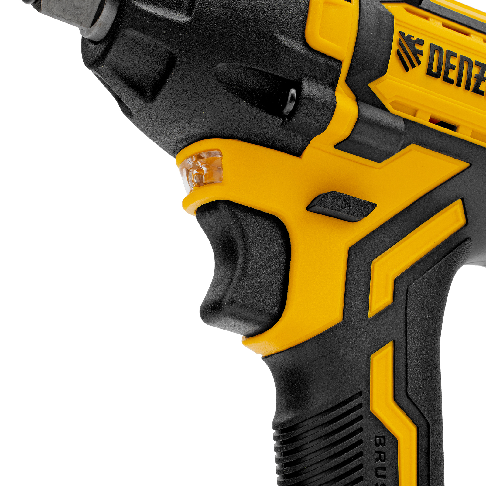 Аккумуляторный ударный гайковерт Denzel CIWH-BL-20-350 26520 с бесщеточным двигателем работает от аккумулятора Li-Ion 20 В и используется для закручивания и откручивания гаек, болтов и другого резьбового крепежа. Доступно 3 режима работы, при которых частота вращения шпинделя составляет 0-1500, 0-2000 и 0-2500 об/мин, а частота ударов — 0-2100, 0-2800 и 0-3500 уд/мин. Реализована функция электронной регулировки частоты вращения в зависимости от степени нажатия на клавишу пуска, что позволяет установить оптимальную скорость и усилие затяжки. Максимальный крутящий момент составляет 350 Н·м — этого достаточно для эффективного решения поставленных задач. Ударный механизм упрощает работу с туго затянутым и заржавевшим крепежом.