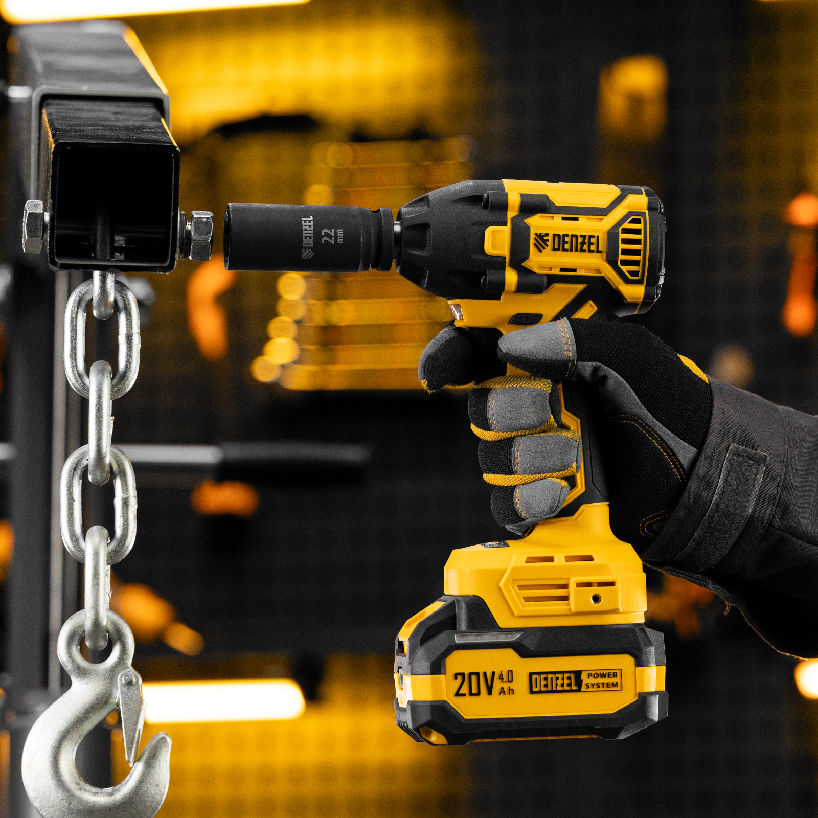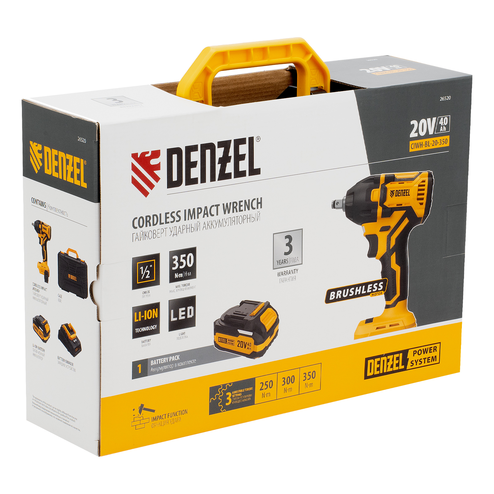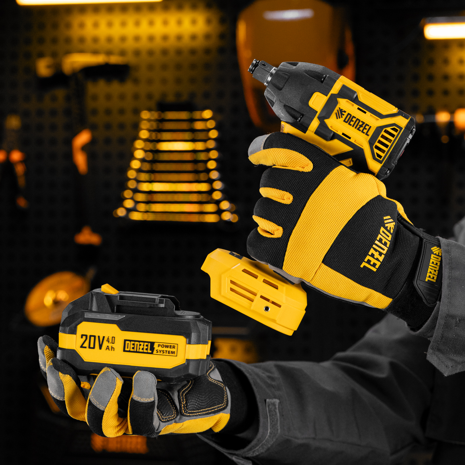 - Универсальность — аккумулятор Li-Ion емкостью 4 А·ч совместим со всеми инструментами единой платформы Denzel Power System 20V.