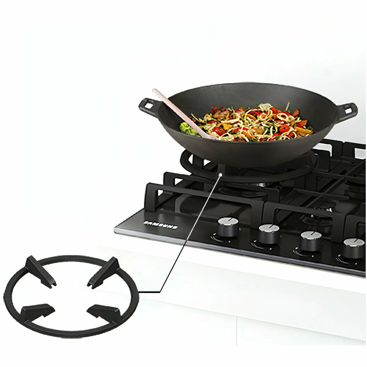 Газовая варочная поверхность Samsung оснащена специальной решеткой для приготовления на сковороде -Вок-. Ее круглая форма позволяет обеспечить устойчивость -Вока- или других больших кастрюль во время приготовления. Наконец, посуда всегда будет находиться над центром конфорки, так что разогрев будет равномерным, а блюда - сочными и вкусными.