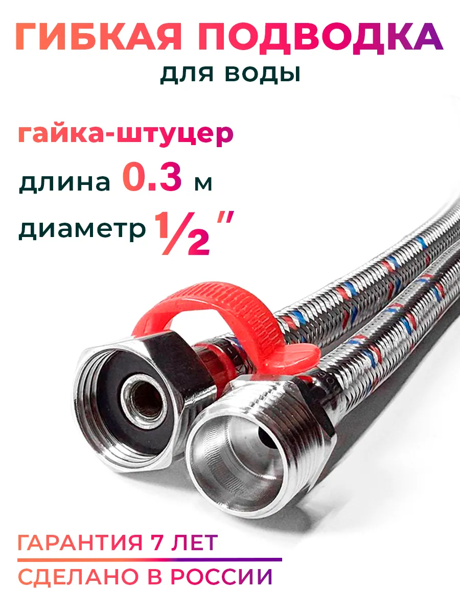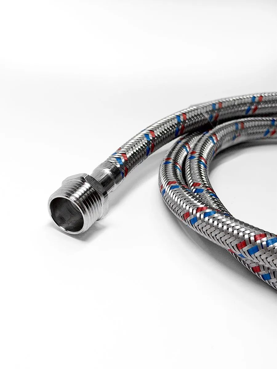 Описание и преимущества:Гибкая подводка для воды MK Plast представляет собой шланг для воды из EPDM (нетоксичный каучук) оплетенный нитью из нержавеющей стали.Состав: Оплетка из высококачественной нержавеющей стали 201 состоит из 7 нитей, толщиной 0,18 мм каждая. Оплетка с вкраплениями красных и синих нейлоновых нитей, характеризует горячее и холодное водоснабжение.Внутренний шланг и прокладка из нетоксичной резины EPDM. Штуцер, ниппель,обжимная гильза изготовлены из нержавеющей стали марки 201. Гибкая подводка для воды MK Plast предназначена для присоединения к трубопроводам приборов водоснабжения, отопительного, сантехнического оборудования. Гибкая подводка для воды MK Plast рассчитаны на эксплуатацию при рабочем давлении 10 бар (максимальное давление – 20 бар) и температуре от 1 до 90 °C (максимальная температура – 100 °C). Внутренний диаметр шланга – 8,5 ± 0,5 мм.