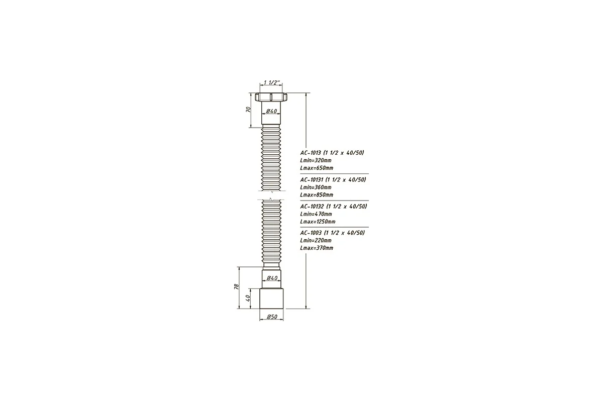 Гибкая труба ORIO 1 1/2х40/50, максимальная длина 1250 мм АС-10132 без выпуска, с латунной гайкой с резьбой 1 1/2". Используется для соединения сифона с торцевым выходным соединением с диаметром 40 мм или выпуска с резьбой 1 1/2" и канализации с входом д.50мм или д.40мм. Длина гибкой трубы 470-1250мм.