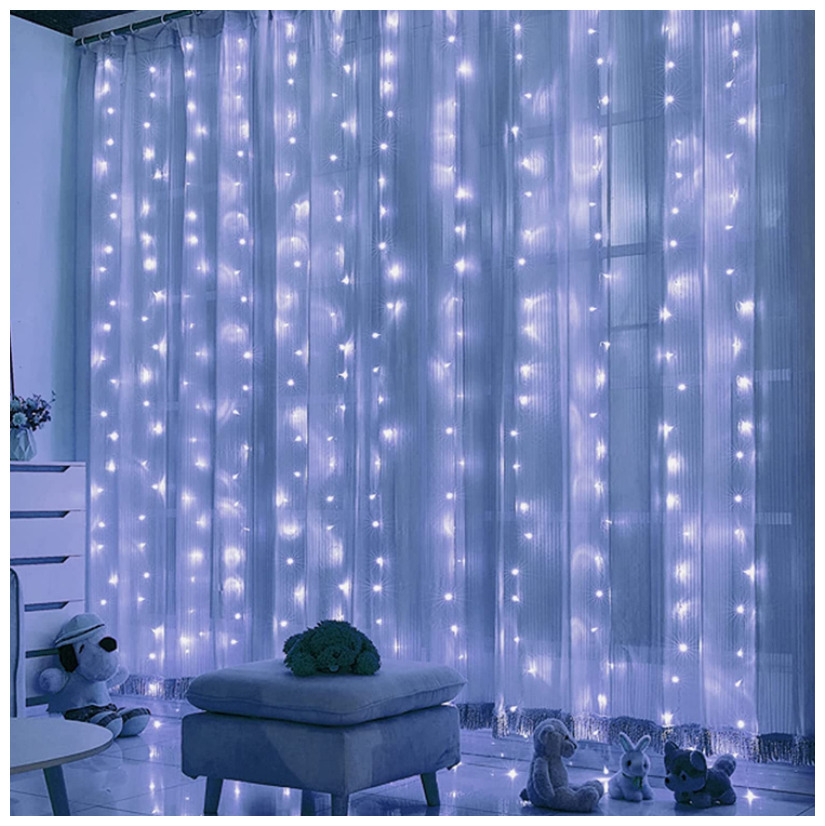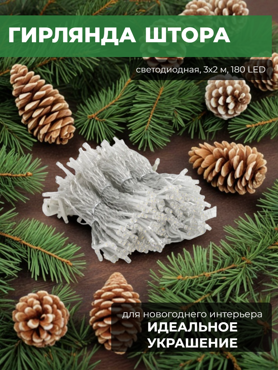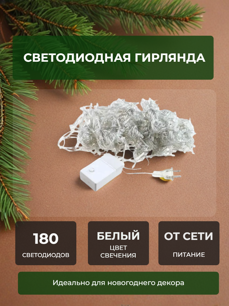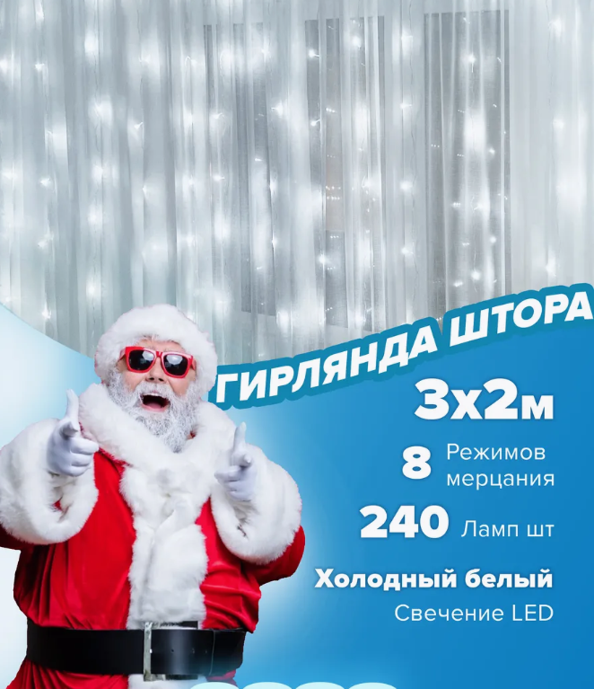 Новогодняя гирлянда штора белая холодная размер 3х2 метра. 8 режимов мерцания. 180 ламп, силиконовая оболочка обеспечивающая защиту от влаги. Прозрачная нить гибкая без изломов. Не нагревается. Подходит как для украшения дома так и улицы.