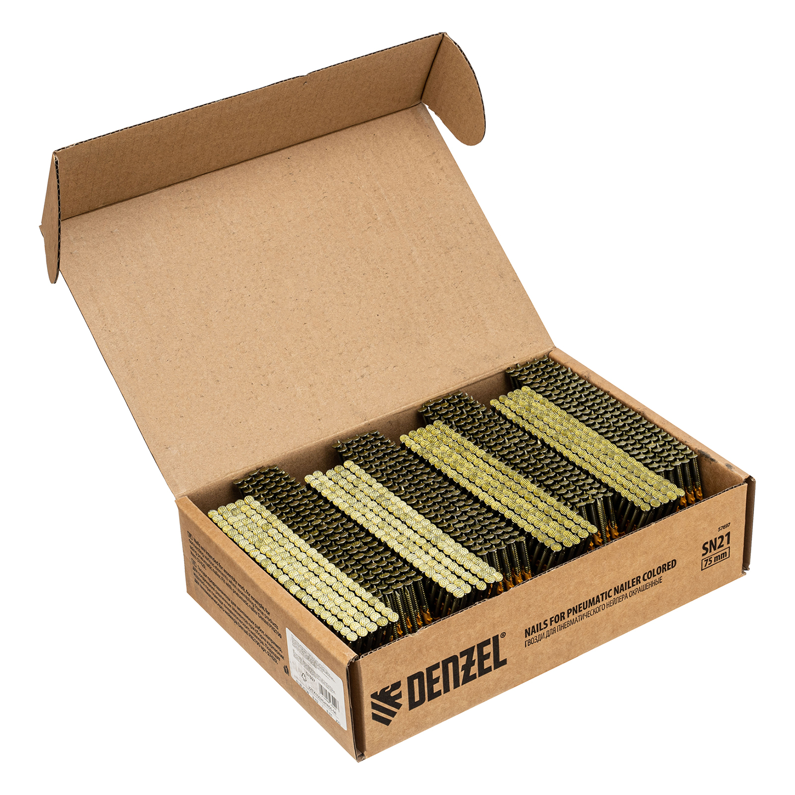 Гвозди Denzel 57697 типа SN21, длиной 75 мм и диаметром 3,05 мм, с крашеной поверхностью, 2000 шт. в упаковке, — расходники для пневматического нейлера. Используются для скрепления различных материалов, будут полезны во время сборочных и отделочных работ.