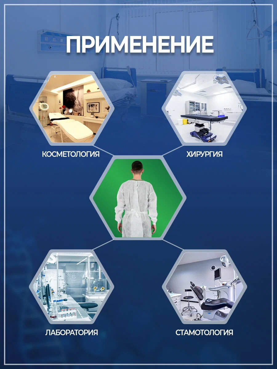 Халат хирургический нестерильный изготовлен из гипоаллергенного, безворсового, воздухопроницаемого, водоотталкивающего полипропиленового нетканого материала плотностью 42 гр/кв. м. Обеспечивает высокий защитный барьер от жидкостей и бактерий. Завязки на вороте и поясе, на спине запах, рукав на плотной большой резинке. Халаты используются для применения во всех помещениях стационаров, процедурных кабинетах и перевязочных, на пищевом производстве, в чистых помещениях, а так же в лабораториях. Материал: Спанбонд Плотность: 42г/м2 Размеры: длина 140 см, ширина: 140-160 см Рукав: на трикотажной манжете или на резинке Манжеты: мягкие трикотажные 7 см Застежка: завязки на поясе