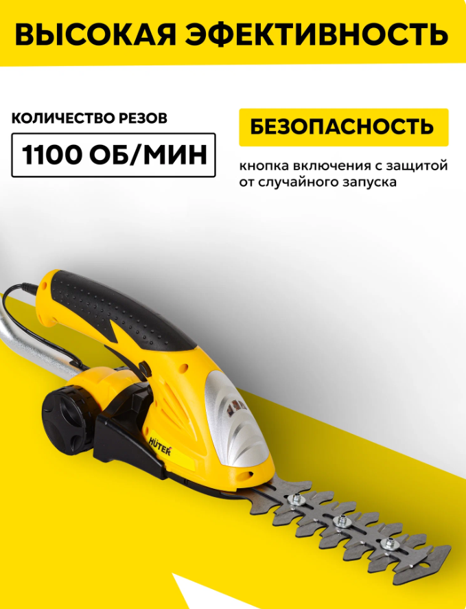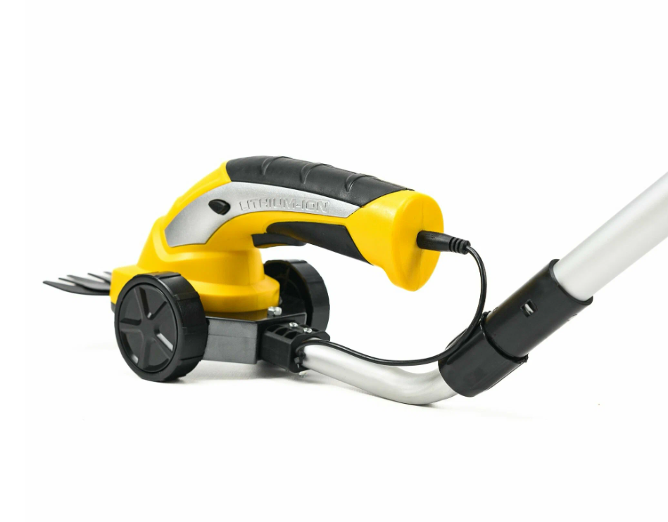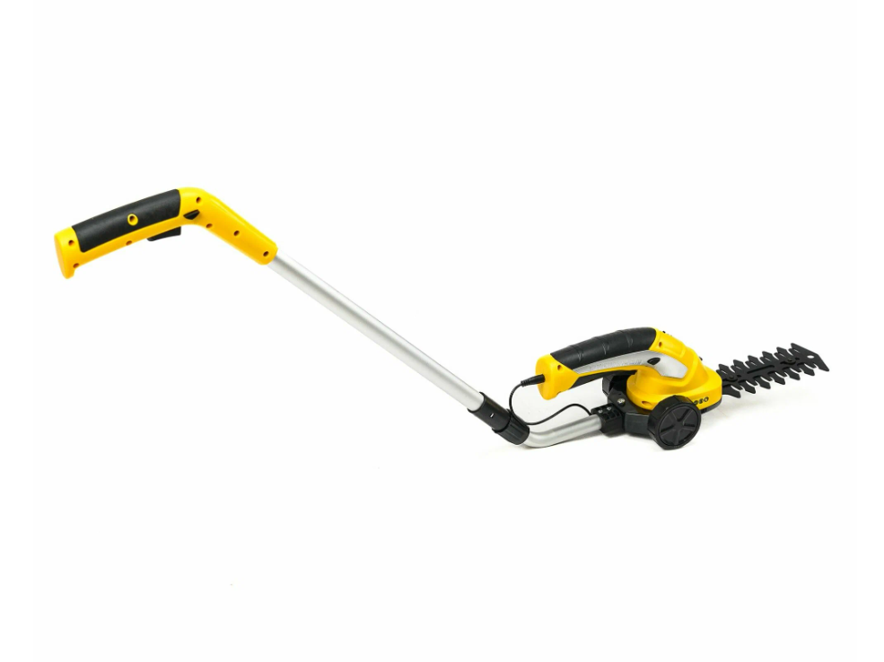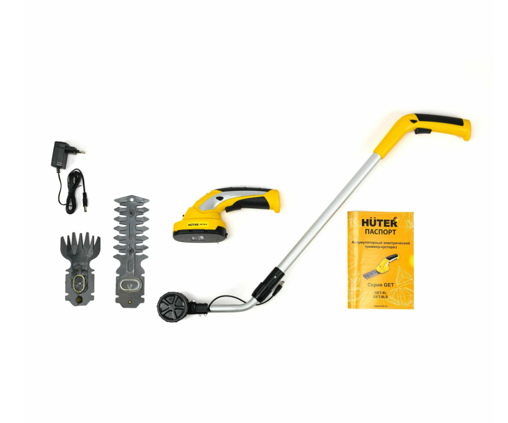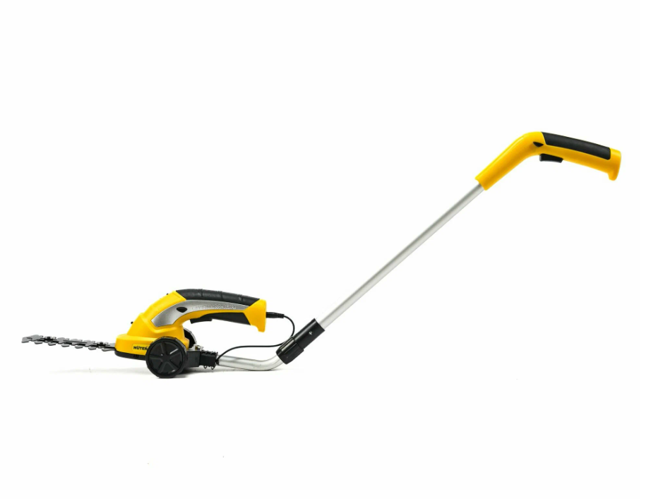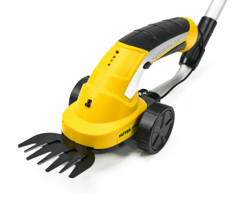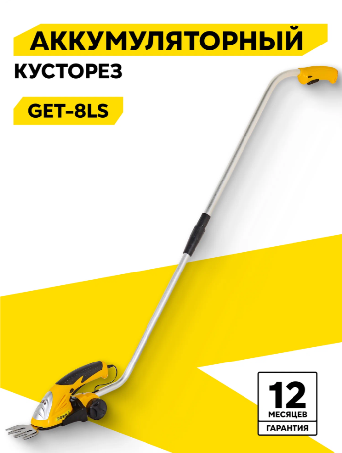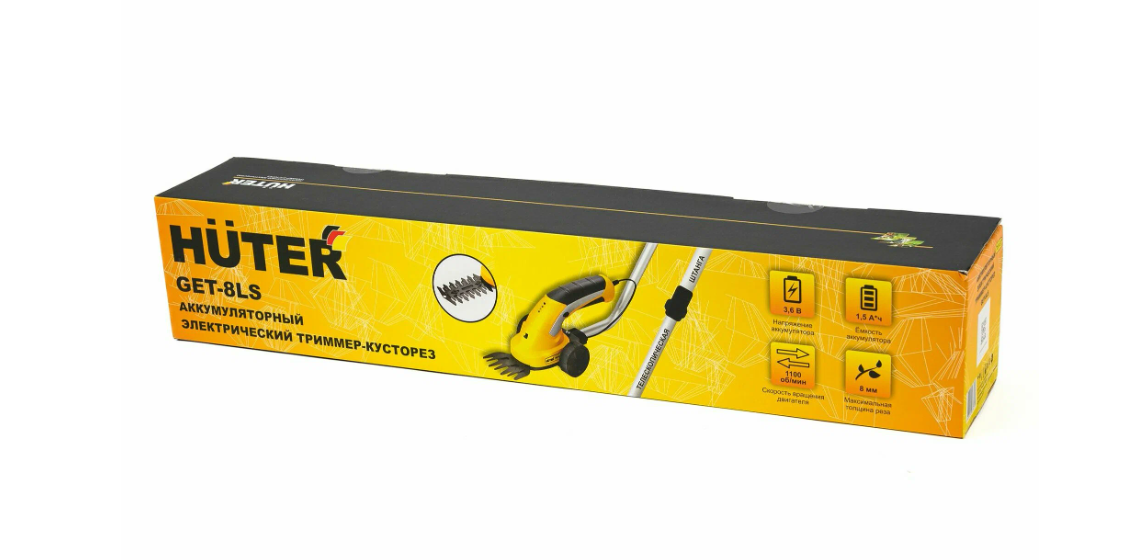 Аккумуляторный электрический триммер-кусторез Huter GET-8LS работает от аккумуляторной батареи и не требует подключения к сети. Кусторез предназначен для стрижки кустов, кустарника, обрезки веток, а также в качестве садовых ножниц для срезания сорняков и подравнивания травы в ограниченном пространстве и труднодоступных для полноразмерной косилки местах. Фигурные ножницы этой садовой техники позволяют стричь кусты различных форм. Газонные ножницы справляются с хвойниками. Легкое и компактное устройство садового кустореза оснащено Li-ion аккумуляторной батареей с напряжением 3,6 В емкостью 1,5 Ач. Встроенный электродвигатель в аккумуляторный кусторез имеет скорость вращения 1100 об/мин, работает тихо и без ощутимой вибрации. В качестве режущего элемента в данной модели используются сменные гребенчатые ножи. В комплектацию аккумуляторного кустореза входит телескопическая штанга и два лезвия: вертикальное предназначенное для облагораживания кустарники и горизонтальное для стрижки травы и бурьяна. Удобная телескопическая штанга позволяет стричь газон. Кусторез садовый имеет удобную эргономичную рукоятку с антискользящей ребристой накладкой и защитой от непреднамеренного включения. На ней также расположен светодиодный индикатор заряда батареи, включающийся отдельной кнопкой.