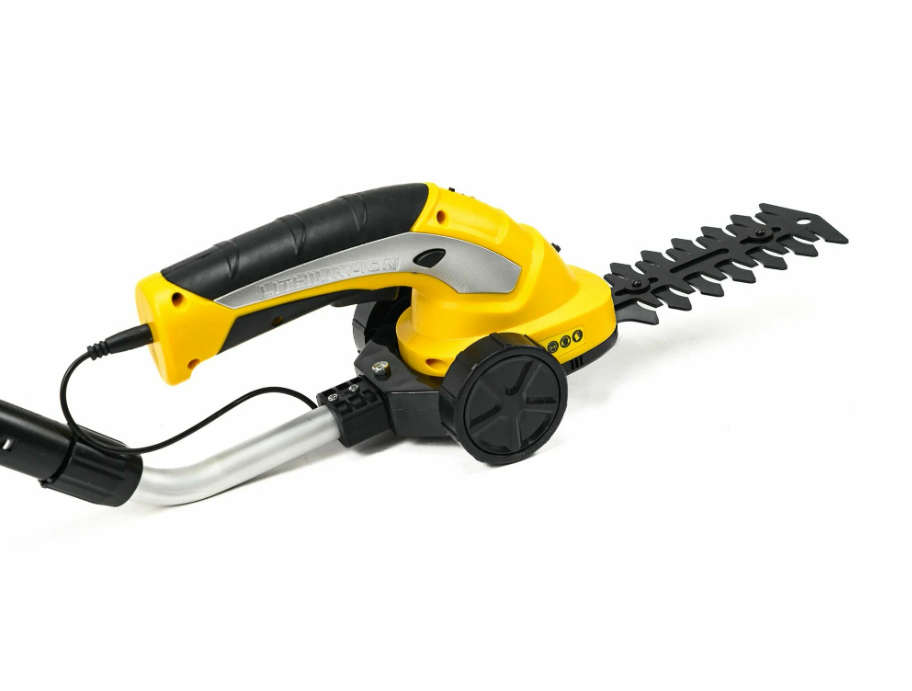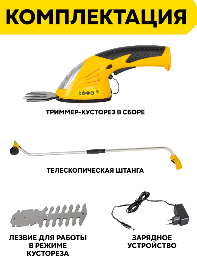 Триммер-кусторез в сборе. Аккумулятор 1 шт. Зарядное устройство 1шт. Лезвие для работы в режиме кустореза 1 шт. Лезвие для работы в режиме стрижки газона 1 шт. Руководство по эксплуатации.