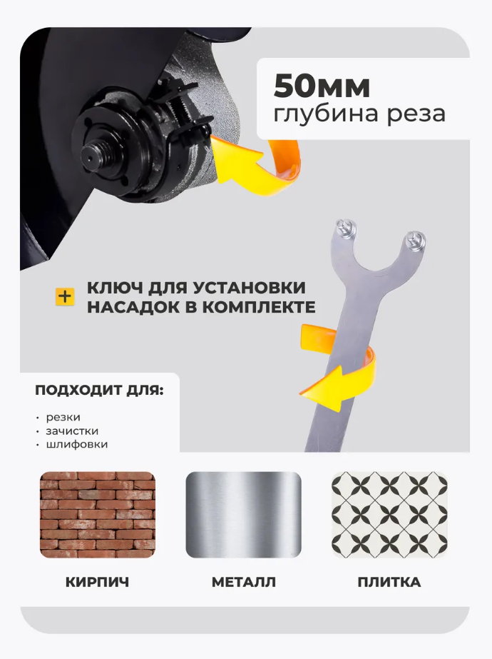 Вид кнопки включения нажимная. Max глубина реза 50 мм.