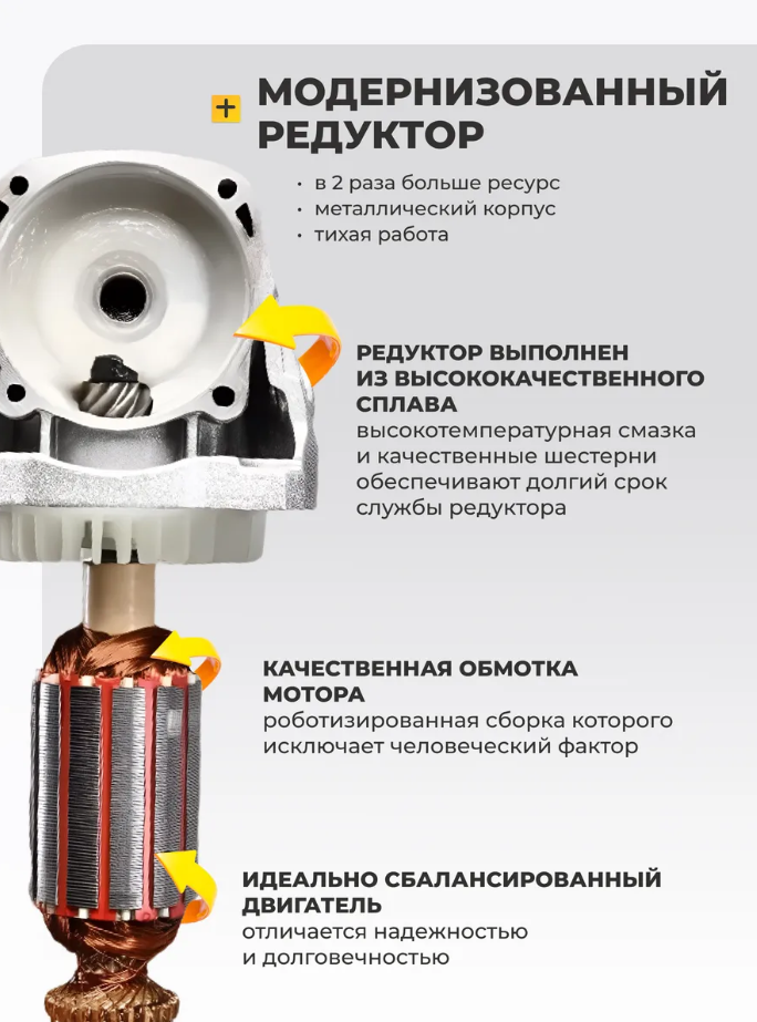 Модель оснащена электронной регулировкой оборотов, что позволяет эффективно справляться с различными задачами. На корпусе расположена специальная кнопка, предотвращающая случайное включение. Ручка фиксируется в трех положениях, что обеспечивает комфорт при работе в различных положениях и плоскостях. Вентиляционные отверстия на корпусе обеспечивают эффективное охлаждение двигателя, увеличивая его ресурс работы.