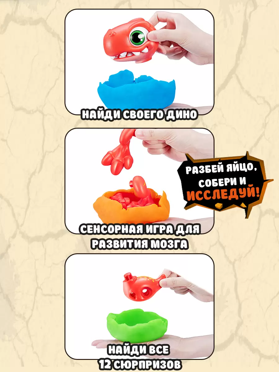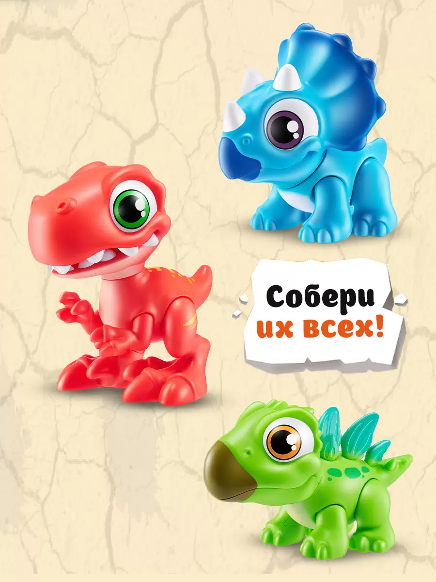 6 частей тела Дино (всего 1 динозавр), 1 яйцо Дино, 3 цветные полоски теста Дино, 3 формочки, 3 наклейки, 1 инструкция, 1 руководство коллекционера