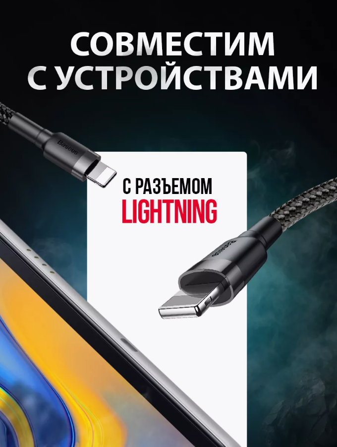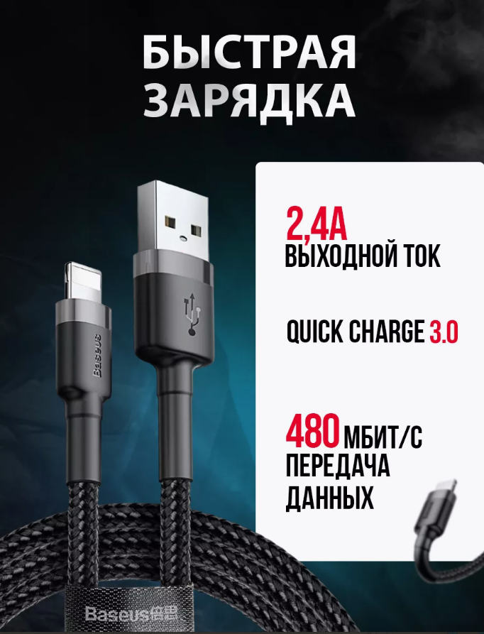 Baseus – один из лидеров на рынке аксессуаров для многофункциональной техники. Дата-кабель Baseus Cafule Cable CALKLF-BG1. Кабель Baseus Lightning для зарядки вашего гаджета Apple - iPhone, iPad и iPod. Поддерживает зарядный ток до 2.4 А, что гарантирует максимально быструю зарядку устройств Apple, а также быструю передачу файлов на скорости до 480 Мб/с. Оптимальная длина шнура позволит без труда подключить и удобно расположить все устройства в рабочем пространстве. Коннекторы выполнены из алюминиевого сплава. Все провода спрятаны под плетеной нейлоновой оберткой, которая придаёт зарядному кабелю эстетичный внешний вид и защищает его от перегрева во время зарядки высоким током. Кроме того, такой шнур лайтинг прочен и долговечен, его можно скручивать, растягивать и даже завязывать узлом.